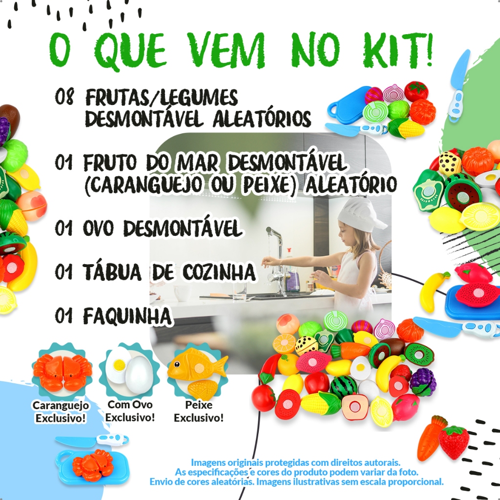 Seu filho demonstra interesse em cozinhar e imitar atividades do dia a dia, mas nem sempre é possível incluir com segurança. Muitos brinquedos não estimulam o aprendizado real e acabam sendo deixados de lado rapidamente. Este kit de frutas e alimentos desmontáveis transforma a brincadeira em uma experiência interativa e educativa. As peças podem ser “cortadas” e unidas novamente através do encaixe, criando uma sensação realista que prende a atenção da criança e estimula o desenvolvimento. O uso da tábua e da faquinha incentiva movimentos coordenados, enquanto as cores vibrantes ajudam no reconhecimento visual e na criatividade. Além disso, o kit inclui itens diferenciados como peixe, ovo e caranguejo, tornando a brincadeira ainda mais completa e variada. BENEFÍCIOS • Estimula coordenação motora fina e controle dos movimentos • Desenvolve raciocínio lógico e associação de formas • Ajuda no reconhecimento de cores e alimentos • Promove foco e concentração por mais tempo • Alternativa prática para reduzir tempo em telas O QUE ACOMPANHA • 08 frutas e legumes desmontáveis aleatórios • 01 fruto do mar desmontável (peixe ou caranguejo) • 01 ovo desmontável • 01 tábua de corte • 01 faquinha infantil MEDIDAS • Frutas e legumes: entre 5 cm e 9 cm • Tábua de corte: 13,5 cm • Faquinha: 15 cm INFORMAÇÕES IMPORTANTES • Peças com encaixe para montagem e desmontagem • Cores enviadas de forma aleatória conforme lote • Material leve e resistente, ideal para uso infantil • O Kit acompanha apenas 1 fruto do mar desmontável (peixe ou caranguejo)