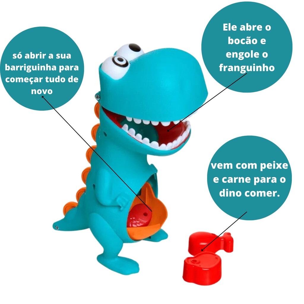 Dê comidinha para o Dino Papa Tudo. Ele abre o bocão e engole o franguinho, o peixe e a carne direitinho! Depois é só abrir a sua barriguinha para começar tudo de novo. Esse amiguinho tem diversas atividades que estimulam a criatividade. Características: - Marca: Elka - Modelo: ELK-972 *Imagem Meramente Ilustrativa Especificações Técnicas: - Idade Recomendada: Acima de 12 meses - Material: Plástico – Dentes e olho (PS-Poliestireno) Corpo, barriga, boca e escamas (PP-Polipropileno) - Inmetro: REGISTRO 000989/2019 - OCP006REGISTRO 000989/2019 - OCP006 - Dimensões Aproximadas: 26 x 11 x 31cm Conteúdo da embalagem: - 1x Dino - 3x Comidinhas