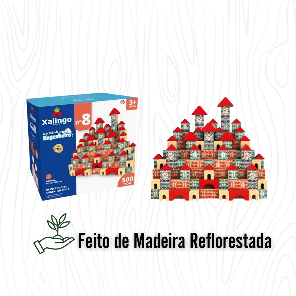 Desperte o engenheiro dentro de você com o novo modelo do Brincando de Engenheiro, agora com ainda mais peças! O Brincando de Engenheiro N° 8, é composto por 500 peças confeccionadas em madeira reflorestada e tinta atóxica. São diversos formatos que possibilitam montagens infinitas, podendo montar agora grandes cidades, do tamanho que você quiser! O brinquedo é perfeito para auxiliar no desenvolvimento do pensamento lógico, imaginação, criatividade, noções espaciais, relações parte e todo, além da coordenação motora. Indicado para crianças a partir de 3 anos. Garanta já e deixe a brincadeira dos pequenos mais divertida e educativa! - Idade: A partir de 3 anos - Feito com Madeira Reflorestada - Dimensões Aproximadas (AxLxC): 30 x 18 x 30 cm - Quantidade de peças: 500 Características: - Marca:Xalingo - Modelo:67865 *Imagens Meramente Ilustrativas* Conteúdo da Embalagem: - 1 caixa com 500 blocos para montar brinquedos para montar - brinquedo com blocos - brinquedos educativos - brinquedos de blocos - brinquedos de montar - brincando de engenheiro - blocos para montar - blocos de montar 500 peças - brinquedos infantis - brinquedos para crianças - brinquedos para crianças 3+ - brinquedos para crianças de 3 anos - brinquedos para crianças a partir de 3 anos
