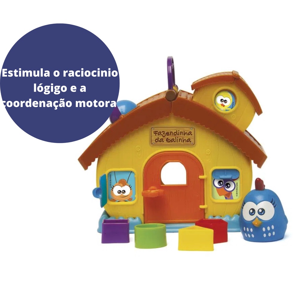 Fazendinha da Galinha com um monte de atividades! Gire a chave e abra a portinha. Janelinha com surpresa. Levante o telhado para guardar as peças. Bolinha gira-gira. Peças com forma geométricas para encaixar. Boneco para brincar! Características: - Marca: Elka brinquedos - Modelo: ELK- 1088 *Imagens Meramente Ilustrativas. Especificações: - Idade Recomendada: Acima de 12 meses. - Material: Plástico e Vinil - Cor: Acessórios e alça = azul e roxo / base e porta = laranja e verde claro/ casinha = amarela/ telhado = marrom/ figuras geométricas = amarela, verde, vermelha e roxa/ galinha = azul - Personagens: Galinha Pintadinha - Inmetro: REGISTRO 002338/2019 - OCP006REGISTRO 002338/2019 - OCP006 - Dimensões Aproximadas: 24 x 14 x 26cm Conteúdo da embalagem: - 1x Fazendinha - 1x Boneco - 4x Peças para encaixar