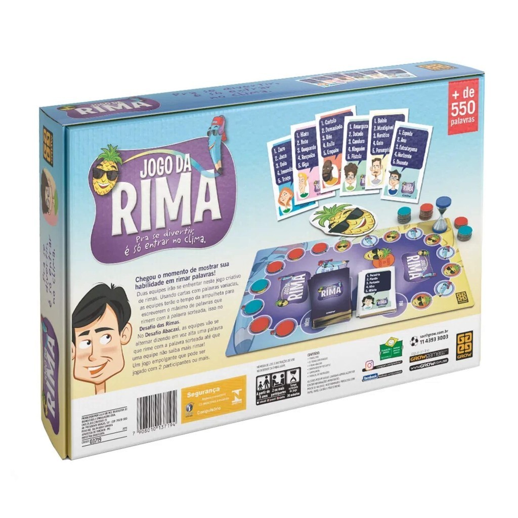 Procurando se divertir? Curtir um bom clima? Então vem conferir o nosso Jogo da Rima! Um jogo fácil para quem é ágil e sabe que ser hábil é questão de ser versátil. Quem quiser ganhar vai ter que lembrar do maior número de rimas antes do tempo acabar. No fim da sessão, não tem dramalhão, quem rimou sem parar vai ser o campeão. Então junte seus pais, seus tios e suas primas e venha brincar neste jogo de rimas! Como jogar o Jogo da Rima? O jogo foi feito para ser jogado a partir de duas pessoas e é recomendado para jogadores com 8 anos ou mais. Ele tem dois modos: o Desafio das Rimas e o Abacaxi. Para o desafio das rimas, forme duas equipes: cada equipe irá sortear uma palavra e tem até o fim do tempo da ampulheta para listar o máximo de rimas possíveis com a palavra sorteada. Ganha quem conseguir listar mais rimas no final. Já no Desafio Abacaxi, as equipes se alternam falando rimas para as palavras até que uma delas não consiga pensar em mais nenhuma. Junte seus amigos e sua família neste jogo de pensamento ágil e muito conhecimento! Idade: A partir de 8 anos Participantes: 2 ou mais participantes Tempo estimado de jogo: Indeterminado Especificações Técnicas Faixa Etária : A partir de 8 anos Dimensões Aproximadas da embalagem : 23,0 x 35,5 x 6,5 cm Participantes : 2 ou mais Outras Informações: Não recomendável para menores de 3 anos, por conter partes pequenas. Características: - Marca: Grow - Modelo: 03719 *Imagens Meramente Ilustrativas* Conteúdo da Embalagem: - Tabuleiro - Fichas cartonadas - Baralho - Ampulheta - Manual de instruções jogo da rima - jogo de tabuleiro - jogo de pensamento ágil - jogo de conhecimento - jogo de rimas - jogo criativo