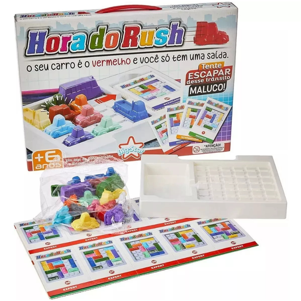 Descrição: -01 Tabuleiro -02 Caminhões -02 Ônibus -12 Carrinhos -40 Cartas Desafios - Marca: Big Star Esse jogo vai mexer com você e desafiar o seu raciocínio lógico garantindo horas de muita diversão e concentração. Veja se você é capaz de sair desse trânsito maluco com o carro vermelho! E digo, não será nada fácil são 40 desafios com movimentos limitados , você moverá os carros sem tirá -los do tabuleiro. O objetivo é retirar seu carro do meio da confusão, e para isso você vai precisar usar o seu Raciocínio Um ótimo jogo para testar toda a sua inteligência de uma forma divertida.