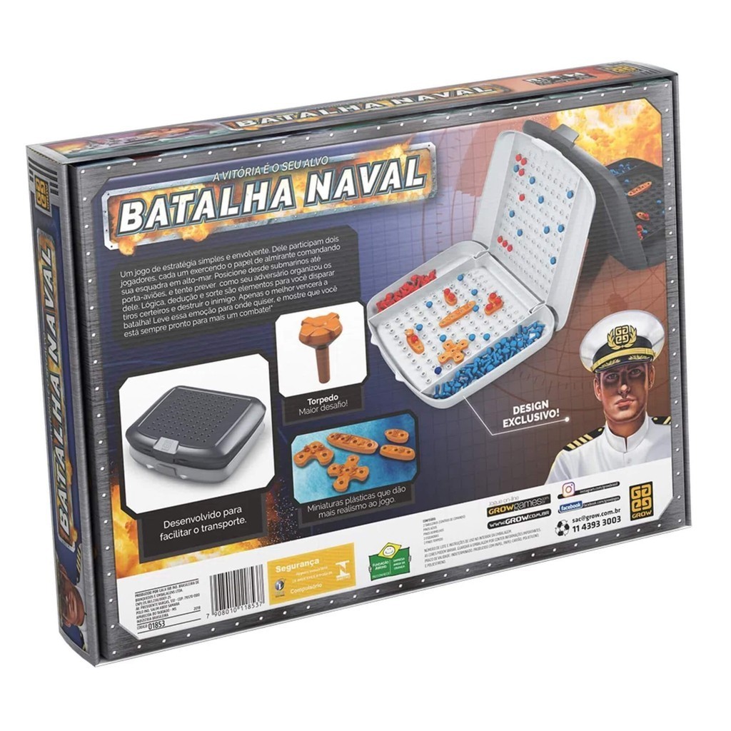 Você gosta de jogos clássicos de tabuleiro que trabalham sua mente, como Batalha Naval? Hoje é seu dia de sorte! Simples e envolvente, o jogo Batalha Naval ajuda a resolver questões lógicas, onde você tenta prever os passos do seu rival e afundar o máximo de embarcações! Aqui na Grow, você encontra o tabuleiro de Batalha Naval com algumas novidades, como novas embarcações e um novo pino torpedo para afundar automaticamente a embarcação inimiga, além de peças plásticas mais realistas e outros diferenciais! Como jogar Batalha Naval? Batalha Naval é ideal para jogadores a partir dos 8 anos! As regras envolvem duas tabelas em estojos com uma separação no meio, onde cada região representa um local onde as peças dos seus barcos podem estar. Depois disso, é preciso usar sua lógica e dedução para disparar tiros certeiros e vencer essa batalha! Ainda é possível levar os estojos para onde quiser, interrompendo a partida a qualquer momento e continuar a diversão depois! Todas as regras de Batalha Naval estão inclusas junto com o manual do jogo, onde basta encontrar um oponente, seguir as instruções e partir para a diversão! Especificações Técnicas Faixa Etária : A partir de 8 anos Dimensões Aproximadas da embalagem: 37,6 x 27,0 x 5,5 cm Participantes : 2 Outras Informações : Não recomendável para menores de 3 anos, por conter partes pequenas. Características: - Marca: Grow - Modelo: 01853 *Imagens Meramente Ilustrativas* Conteúdo da Embalagem: - 2 maletas-tabuleiros, 252 pinos azuis, 84 pinos vermelhos, 2 esquadras, 1 manual de instruções jogo batalha naval - jogo batalha naval grow - jogo de estrategia - jogos de estrategia - jogo de estrategia batalha naval - jogo de estrategia batalha naval grow - jogos da grow