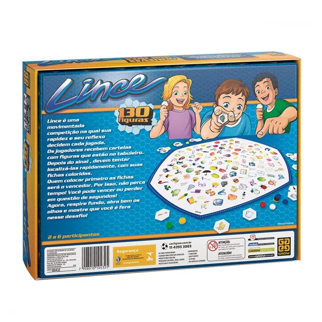 Você já ouviu a expressão “olhos de lince”? É isso que você vai saber se tem com o jogo de tabuleiro Lince! Aqui, você precisa usar toda a sua visão para localizar os seus alvos e ser o grande vencedor deste jogo de tabuleiro! Seja mais rápido do que seus oponentes e veja se você é capaz de encontrar as figuras no tabuleiro! Como jogar Lince? O jogo Lince é ideal para 2 a 6 participantes de todas as idades. Aqui, sua rapidez e seus reflexos fazem toda a diferença! As regras do jogo são as seguintes: os jogadores recebem as cartelas com figuras que estão no tabuleiro. Depois do sinal, é preciso localizá-las rapidamente, com suas fichas coloridas. Quem colocar as fichas primeiro será o vencedor! Por isso, não perca tempo! Você pode vencer ou perder em questão de segundos! Todas as regras do jogo Lince estão incluídas junto com o manual do jogo. Basta encontrar suas companhias, seguir as regras e partir para a diversão! Idade: A partir de 5 anos Participantes: 2 a 6 Tempo estimado de jogo: 30 minutos Especificações Técnicas Dimensões Aproximadas da embalagem: 23,0 x 33,5 x 4,0 cm Participantes: 2 a 6 Outras Informações : Não recomendável para menores de 3 anos, por conter partes pequenas. Características: - Marca: Grow - Modelo: 00432 *Imagens Meramente Ilustrativas* Conteúdo da Embalagem: - 1 tabuleiro, 1 saco plástico, 18 fichas, 130 cartelas ilustradas e 1 manual de instruções jogo de tabuleiro - jogo lince - jogo lince grow - jogo de tabuleiro lince - jogo para 2 pessoas - jogo de 2 pessoas ou mais