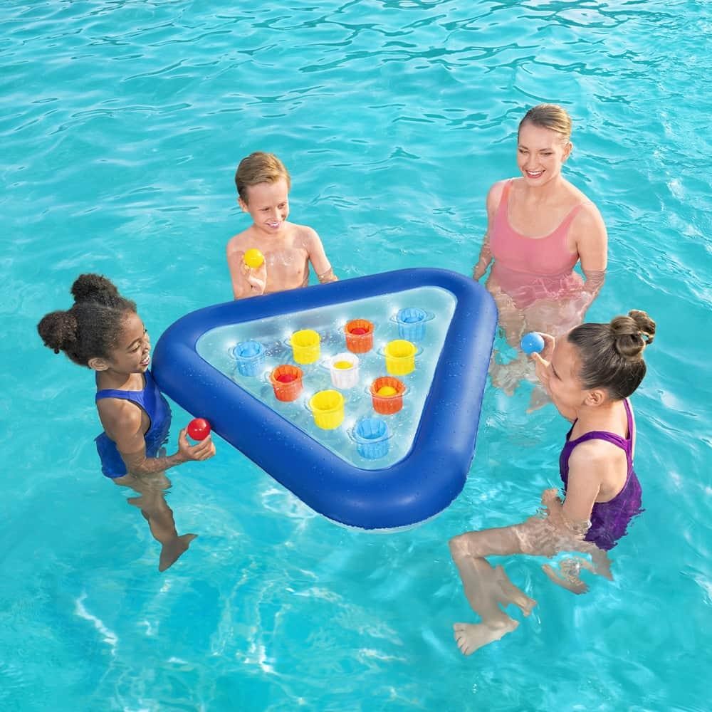 Vamos tornar sua diversão na piscina ainda mais empolgante? Diga adeus ao comum e dê as boas-vindas ao incrível Play Center Campeonato Bola no Copo da Bestway! Com seus 1,05m x 97cm, a bola no copo inflável apresenta 10 buracos para você atribuir pontos, além de vir com 9 bolas. Aqui está uma sugestão de jogo para você: Reúna seus amigos e amigas e formem três equipes, cada uma recebendo um conjunto de 3 bolas com cores correspondentes. Cada buraco, de acordo com sua cor, pode receber uma pontuação específica. Agora é a hora de se revezar: lance a bola, torça e marque pontos! Para tornar tudo ainda mais emocionante, você pode retirar pontos se a bola tocar a borda da plataforma inflável sem cair no buraco. Se uma é bom, duas são excelentes: Divida em três equipes, cada equipe terá 3 bolas de cores iguais, que só marcará ponto se a bola cair dentro do buraco com a mesma cor. Vamos deixar sua diversão na piscina ainda mais animada e cheia de risadas! ESPECIFICAÇÕES: Indicado para 3+ anos Tamanho da embalagem do produto: 30 cm x 6,5cm x 30cm; Tamanho do produto inflado: 99cm x 31cm x 13cm; Tamanho do produto desinflado: 105cm x 97cm; Peso do produto: 653g; Contém 10 buracos com cores distintas; 9 bolas com 3 cores diferentes; Composição do produto: PVC 100%. Conteúdo: 1 plataforma inflável com 10 buracos; 9 bolas; Remendo de reparação.