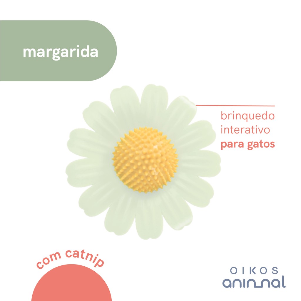 Conheça o Brinquedo interativo margarida da Oikos Animal. É uma flor interativa! Possui a erva gateira, que entretém e diverte o seu animal, além de coçar, massagear, atrair e relaxar. Possui ventosa e é livre de substâncias tóxicas! Peso da erva dos gatos: 5g Pode ser utilizado por gatos a partir de 6 meses. Leve diversão e segurança para o seu pet!