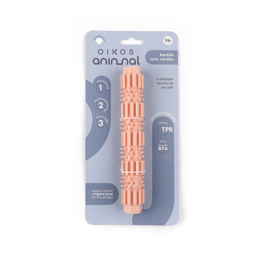 Esse é o bastão com cerdas da OIKOS ANIMAL, a distração favorita do seu pet! Porta-petisco: possui uma cavidade pra você prender petiscos e estimular seu pet a brincar! Antiestresse: ótimo brinquedo pra aliviar ansiedade, saciar vontade de morder e distrair o cão por algum tempo ;) Saudável: as cerdas massageiam a gengiva do seu amigo e ajudam a limpar seus dentes enquanto ele brinca. xô, tártaro! Durável: feito de TPR, um material resistente e macio. Multissensorial: o brinquedo possui texturas distintas que instigam sua percepção dos sentidos. Atóxico e livre de BPA: pra você não precisar se preocupar com a segurança do seu pet. Dica: pra brincadeira ficar mais divertida e saudável, que tal colocar um pouquinho de creme dental pra pet entre as cerdas? Pode ser usado por: cães de pequeno e médio porte." Dimensoes do produto: Comprimento: 18cm Altura: 3cm