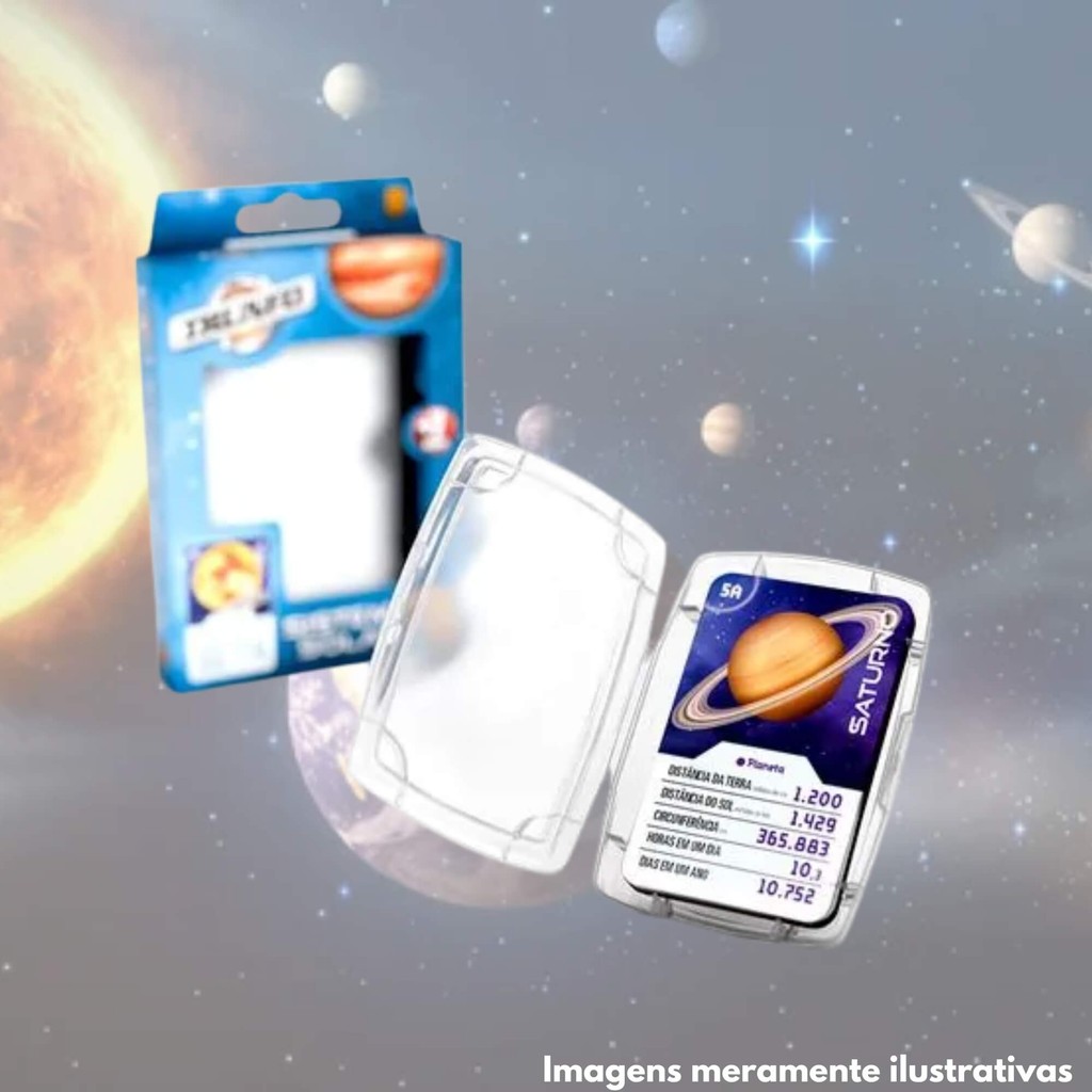 Descubra o emocionante mundo do 'Jogo Super Trunfo Sistema Solar Grow', um jogo de cartas que desafia seus conhecimentos sobre o universo! Com 32 cartas fascinantes, você poderá explorar temas como a circunferência dos planetas e a distância do Sol, enquanto compete com amigos e familiares. Este jogo é ideal para crianças a partir de 7 anos, promovendo aprendizado e diversão ao mesmo tempo. A partida é projetada para 2 jogadores, garantindo momentos de interação e estratégia. Acompanha uma caixa plástica para armazenamento e uma regra clara para facilitar o entendimento. Com a certificação CE-BRI/ICEPEX-N 01264-25, você pode confiar na qualidade e segurança do produto. Prepare-se para se tornar um verdadeiro especialista em Sistema Solar com a Grow! Especificações: Faixa Etária: A partir de 7 anos Componentes: Contém 32 cartas, 1 caixa plástica e 1 regra Dimensões da embalagem: 15,2 x 10 x 2 cm Participantes: 2 a 8 Garantia contra defeitos de fabricação (meses): 3 Certificação Inmetro: CE-BRI/ICEPEX-N 01264-25 Outras Informações: Não recomendável para menores de 3 anos Características: - Marca: Grow - Modelo: 04753 *Imagens Meramente Ilustrativas* Conteúdo da Embalagem: - 01 Jogo de Cartas Super Trunfo Sistema Solar 32 Cartas Grow