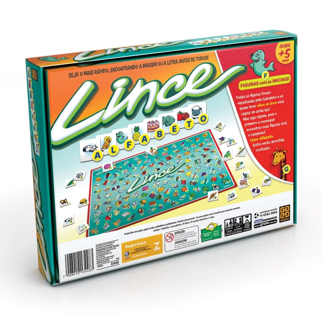 Seja o mais rápido, encontrando a imagem ou a letra antes de todos! Lince é uma movimentada competição na qual sua rapidez e seu reflexo decidem cada jogada. Os jogadores recebem as cartelas com figuras e letras que estão espalhadas no tabuleiro e depois do sinal, devem tentar localizá-las rapidamente, com suas fichas coloridas. Quem colocar primeiro as fichas será o vencedor. Por isso, não perca tempo! Você pode vencer ou perder em questão de segundos! Nesta famosa versão o jogador poderá utilizar das iniciais de cada figura para localizar no tabuleiro. As cartelas trazem a letra inicial da figura ilustrada. Sobre este item: - Os jogadores recebem as cartelas com figuras e letras que estão espalhadas no tabuleiro e depois do sinal, devem tentar localizá-las rapidamente, com suas fichas coloridas - Quem colocar primeiro as fichas será o vencedor; por isso, não perca tempo! você pode vencer ou perder em questão de segundos! - Nesta famosa versão o jogador poderá utilizar das iniciais de cada figura para localizar no tabuleiro. - A partir de 5 anos para 2 a jogadores - Tempo estimado de uma partida 20 minutos. Especificações Técnicas: Dimensões Aproximadas da embalagem: 31,0 X 23,5 x 4,5 cm Participantes : 2 a 6 Outras Informações : Não recomendável para menores de 3 anos por conter partes pequenas. Características: - Marca: Grow - Modelo: 03448 *Imagens Meramente Ilustrativas* Conteúdo da Embalagem: - Contém: 1 tabuleiro, 1 saco plástico, 18 ficas coloridas, 121 cartelas ilustradas e 1 manual de instruções. jogo lince - jogo lince alfabeto - jogo lince da grow - jogo lince alfabeto grow - jogo de tabuleiro - jogo tabuleiro lince - jogo de tabuleiro lince
