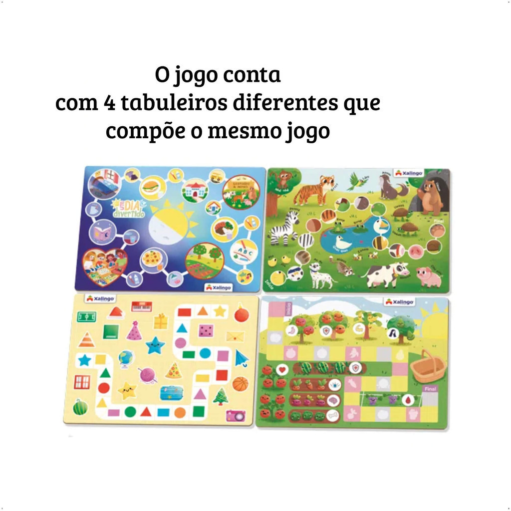 Com o Jogo de Tabuleiro Um dia Divertido da Xalingo, as crianças viverão os eventos da rotina de um dia divertido, intercalando suas obrigações com eventos especiais e hábitos de higiene e saúde! Modo de jogar: O jogo "Um Dia Divertido" é uma forma alegre e agradável de reunir a família e, por meio da brincadeira, contribuir para o aprendizado dos pequenos. É uma introdução ao universo do tabuleiro com o objetivo de desenvolver habilidades de crianças a partir de 3 anos de idade, ele é composto por 4 tabuleiros que estimulam o desenvolvimento motor e cognitivo, a criatividade e o raciocínio lógico por meio da ludicidade. Os objetivos dos tabuleiros devem ser concluídos de maneira individual. Havendo mais de um jogador, o objetivo se torna colaborativo. Utilizando-se o peão escolhido, todos movem o mesmo peão, cada um na sua vez. Os pais vocês devem introduzir as regras e participar nas primeiras partidas, para que os pequenos aprendam e consigam autonomia para brincarem sozinhos. Os EVENTOS ESPECIAIS (casas em destaque, com contornos vermelhos e formas maiores) são de parada obrigatória, pois os eventos destas casas estão representados nos outros tabuleiros. Nesta hora, o jogador migra seu peão para realizar a missão do tabuleiro em questão. São eles: - Passeio da escola ao santuário dos animais; - Horta do bairro no fim de tarde - Brincando de jogo de tabuleiro com a família. Dimensões Aproximadas (AxLxC): Tabuleiro: 30 x 22 cm Idade Recomendada: A partir dos 3 anos Características: - Marca: Xalingo - Modelo: 60609 *Imagens meramente Ilustrativas Conteúdo da embalagem: - 1x Jogo de Tabuleiro um dia Divertido - XALINGO 60609
