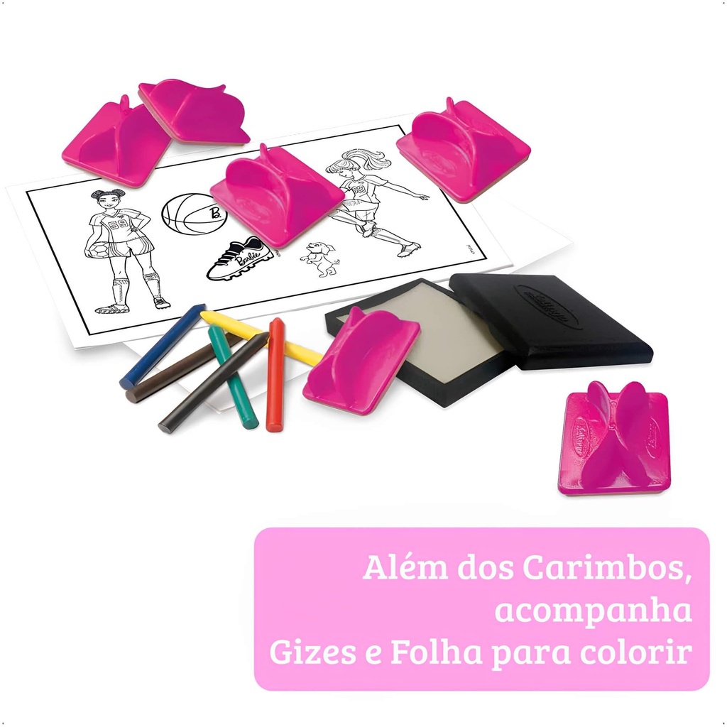 Brincar com carimbos nunca ficou tão divertido! Com os Carimbos dos Esportes Barbie Esportista da Xalingo Brinquedos, a brincadeira está garantida! Conta com 6 carimbos diferentes, de cabo plástico e borracha atóxica. Acompanha 1 almofada para carimbo, 1 frasco de tinta atóxica, 1 bloco de papel e giz de cera para colorir as imagens carimbadas durante a brincadeira. Desenvolve a coordenação motora e as habilidades de identificar, desenhar, pintar, criar e contar histórias a partir de cenários com as suas personagens favoritas! É pura diversão! Indicado para crianças a partir de 4 anos. MODO DE BRINCAR: - Apresentar o conjunto de peças e deixar que a criança explore livremente, carimbando, identificando e descobrindo as possibilidades do material. - Brincar com os carimbos, colorindo os personagens, criando e contando histórias. - Criar uma sequência de desenhos para identificação e contagem. - Aplique um pouco de tinta por toda a superfície da almofada, com movimentos circulares. Caso necessário, aplique mais até obter o desenho completo. Cuidado para não aplicar tinta em excesso. - O tubo de tinta deve ficar longe do alcance de crianças. Em caso de contato com tecidos pode causar manchas permanentes. - Validade da tinta: 6 meses após aberta. Características: - Marca: Xalingo - Modelo: 2317.6 *Imagens meramente ilustrativas Especificações: - Material: Plástico e Borracha - Indicação de idade: +4 anos Conteúdo da Embalagem: - 6x Carimbos - 6x Gizes de Cera- 1x Almofada para Carimbos- 1x Frasco de Tinta- 1x Bloco de Folhas