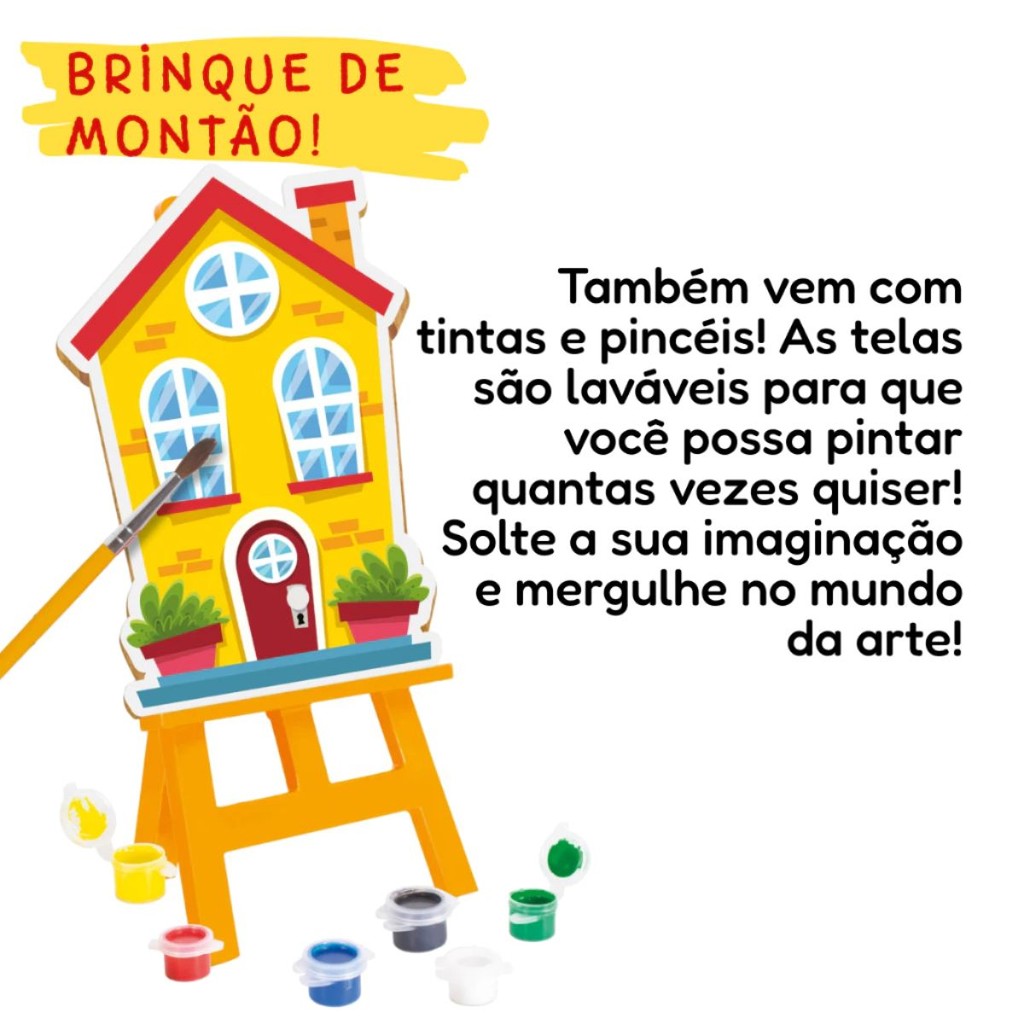 DESCRIÇÃO DO PRODUTO O Brinquedo Pinturinha Casinhas é a escolha perfeita para pequenos artistas a partir de 4 anos! Ele transforma a hora da brincadeira em um momento cheio de imaginação, cor e diversão. Acompanha um cavalete de plástico, tintas coloridas e 4 telas de madeira com 24 cm cada — sendo 3 com desenhos de casinhas superfofas para pintar e 1 tela em branco para a criança criar a sua própria casinha dos sonhos! Ideal para estimular a criatividade, coordenação motora e expressão artística de forma lúdica e educativa. CARACTERÍSTICAS TÉCNICAS: Conteúdo da Embalagem: 01 Cavalete plástico, 04 telas em madeira, 06 tintas guache, 01 pincel Dimensões Aproximadas do Produto: 25 cm (Altura x Largura x Comprimento/Profundidade). Dimensões Aproximadas da Embalagem: 25 cm x 20 cm x 6 cm (Altura x Largura x Comprimento/Profundidade). Material/Composição: Madeira MDF, peças em polipropileno, tinta pigmentada e conservantes Idade Mínima Recomendada: A partir de 4 anos Participantes: A partir de 1 pessoa Alimentação: Não se aplica Marca: Nig Brinquedos Referência: 0241 Outras informações: As cores podem variar entre as imagens mostradas acima e o produto. Imagens meramente ilustrativas. Aviso: As informações e imagens divulgadas são de total responsabilidade do fabricante/fornecedor. Produto lacrado e disponível a pronta entrega para todo Brasil! APROVADO PELO INMETRO