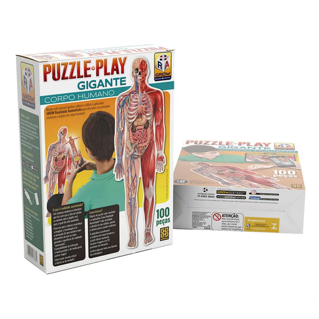 Além de estimular o raciocínio lógico e a concentração, o quebra-cabeça do Corpo Humano com realidade aumentada oferece às crianças um jeito divertido e interativo de aprender tudo sobre a nossa anatomia. A imagem do puzzle é uma ilustração educativa do corpo humano com peças com formato de alguns órgãos e um aplicativo de celular ou tablet que facilita à criança visualizar, em três dimensões, os sistemas do corpo (digestório, musculoesquelético, circulatório, respiratório e nervoso). Com realidade Aumentada O que é Realidade Aumentada? Um sistema moderno e interativo que faz com que a tela do celular se misture com o objeto real para o qual ele está apontando. Uma vez que a câmera reconheça a imagem, a tecnologia cria a sensação de que existem mais elementos do que os reais, gerando a aparência de realidade aumentada. A possibilidade de interação é muito grande e, de modo geral, parece magia! Entre neste mundo virtual e divirta-se de verdade! Importante: Para ver a Realidade Aumentada é necessário um smartphone ou tablet. Baixe o aplicativo Grow Realidade Aumenta disponível no Google Play e App Store. - Contém 100 peças - Dimensões aproximadas do puzzle: 75 cm x 24 cm - A partir de 6 anos Especificações Técnicas: Tamanho Aproximado da Imagem : 75,0 x 24,0 cm Dimensões Aproximadas da embalagem : 27,0 x 19,4 x 7,0 cm Outras Informações : Não recomendável para menores de 3 anos, por conter partes pequenas. Características: - Marca:Grow - Modelo: 03636 *Imagens Meramente Ilustrativas* Conteúdo da Embalagem: - 01 quebra-cabeça de 100 peças puzzle play gigante - puzzle gigante - quebra cabeça puzzle - quebra cabeça corpo humano - puzzle corpo humano - puzzle gigante corpo humano - puzzle - quebra cabeça