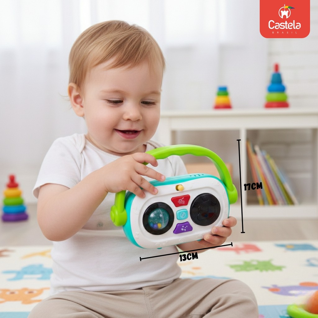 DESCRIÇÃO DO PRODUTO O Rádio Musical com Luz e Som é perfeito para estimular a imaginação e a criatividade das crianças. Com luzes divertidas e sons iterativos, garante momentos de diversão e aprendizado, ajudando no desenvolvimento da coordenação motora e da percepção sensorial. Compacto e leve, é ideal para acompanhar a criança em qualquer lugar. CARACTERÍSTICAS TÉCNICAS: Conteúdo da Embalagem: 1 Rádio Musical com Luz e Som Dimensões Aproximadas do Produto: 17 cm (Altura) x 13 cm (Largura) Dimensões Aproximadas da Embalagem: 23 cm (Altura) x 18 cm (Largura) x 8 cm (Profundidade) Material/Composição: Plástico resistente Idade Mínima Recomendada: A partir de 12 meses Participantes: A partir de 1 pessoa Alimentação: 2 pilhas AA (não inclusas) Marca: Castela Referência: CBS0808 Outras informações: As cores podem variar entre as imagens mostradas acima e o produto. Imagens meramente ilustrativas. Aviso: As informações e imagens divulgadas são de total responsabilidade do fabricante/fornecedor. Produto lacrado e disponível a pronta entrega para todo Brasil! APROVADO PELO INMETRO