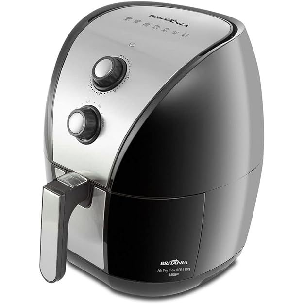 Prepare receitas deliciosas, como carnes, batatas fritas crocantes, pudins e tudo o que sua imaginação permitir, com a praticidade da Air Fryer Britânia BFR11PG Inox Gold. Para garantir alta performance no seu dia, a Air Fryer Britânia BFR11PG conta com 1500W de potência e tecnologia Air Flow 360°, com uma eficiente circulação de ar quente por todo o cesto. Além disso, não precisa utilizar óleo nos preparos e seu cesto possui o incrível revestimento Gold, com um poderoso antiaderente para você preparar os mais variados tipos de alimentos sem grudar e facilitar a limpeza. O cesto é lavável na mão ou na máquina de lavar louças, ou seja, muito mais praticidade na sua rotina. Ela também possui controle de temperatura de 80 a 200 °C, capacidade de 3,35 litros para diferentes receitas tamanho família e outras funções que irão te ajudar a preparar alimentos em instantes, de forma prática e saudável. Por fim, seu visual elegante e moderno, mesclando a cor preta com acabamento em aço inox, deixa sua cozinha ainda mais bonita. • Frita com pouquíssimo ou nenhum óleo • Seletor de temperatura com ajuste de 80 a 200°C • Timer de 30 minutos • Capacidade do cesto 3,35L • Capacidade da cuba de 4,4 litros • Luzes indicadoras de funcionamento • Base antiderrapante • Cesto removível com revestimento antiaderente na Cor “Gold” • Trava de segurança • Sistema de proteção contra sobreaquecimento • Acabamento frontal em inox • Composição: Metal e Plástico