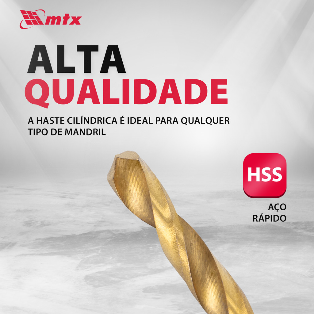 Broca MTX em Aço HSS com Revestimento de Nitreto de Titânio – Alta Performance e Precisão A Broca MTX, feita de aço rápido HSS com revestimento de nitreto de titânio e haste cilíndrica, é uma ferramenta de precisão projetada para criar furos em uma variedade de metais. Seu ângulo de afiação de 118° é meticulosamente escolhido para otimizar o trabalho com metais pretos, aço, ferro fundido e bronze duro. É a escolha ideal para profissionais que enfrentam tarefas exigentes e buscam resultados de alta qualidade. Principais Vantagens • Confiabilidade Fabricada em aço rápido HSS universal de alta resistência. Revestimento de nitreto de titânio que protege contra corrosão e superaquecimento. Suporta cargas intensas sem comprometer o desempenho da ferramenta. • Trabalho Eficiente Superfície polida que facilita a remoção de cavacos. Redução significativa do aquecimento durante a perfuração. Perfuração limpa e precisa, mantendo a integridade do material. • Versatilidade Haste cilíndrica compatível com a maioria dos mandris. Pode ser utilizada em diversos equipamentos de perfuração. Ideal para oficinas, indústrias e aplicações gerais. Especificações do Produto Material: Aço Rápido (HSS) Revestimento: Nitreto de Titânio Tipo de Haste: Cilíndrica Ângulo de Afiação: 118° Aplicação: Metais pretos, aço, ferro fundido, bronze duro Diâmetro da Broca: 10 mm Comprimento Total: 133 mm Comprimento da Parte de Corte: 87 mm Compatibilidade: Furadeiras manuais e máquinas estacionárias com mandril cilíndrico