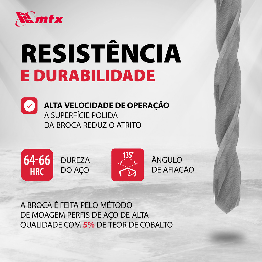 Conjunto com 2 Brocas MTX 714119 – 3 mm em Aço HSS com 5% Cobalto Descrição: Conjunto com duas brocas de 3 mm fabricadas em aço HSS com 5% de cobalto, indicadas para perfuração precisa em metais ligados e coloridos. Com ângulo de afiação de 135°, são ideais para uso profissional em canteiros de obras, oferecendo alta durabilidade e eficiência. Características principais: Alta resistência: Aço HSS com 5% de cobalto que oferece durabilidade e resistência ao desgaste e superaquecimento. Perfuração sem pré-furo: Borda transversal afiada que elimina a necessidade de pré-furação, otimizando o tempo. Velocidade e limpeza: Superfície polida que reduz atrito e melhora a remoção de cavacos, garantindo acabamentos precisos. Compatibilidade universal: Haste cilíndrica adaptável a todos os tipos de mandris. Quantidade: 2 brocas por conjunto. Especificações: Diâmetro: 3 mm Material: aço HSS com 5% de cobalto (Co-5%) Ângulo de afiação: 135° Haste cilíndrica Uso: metais ligados e coloridos
