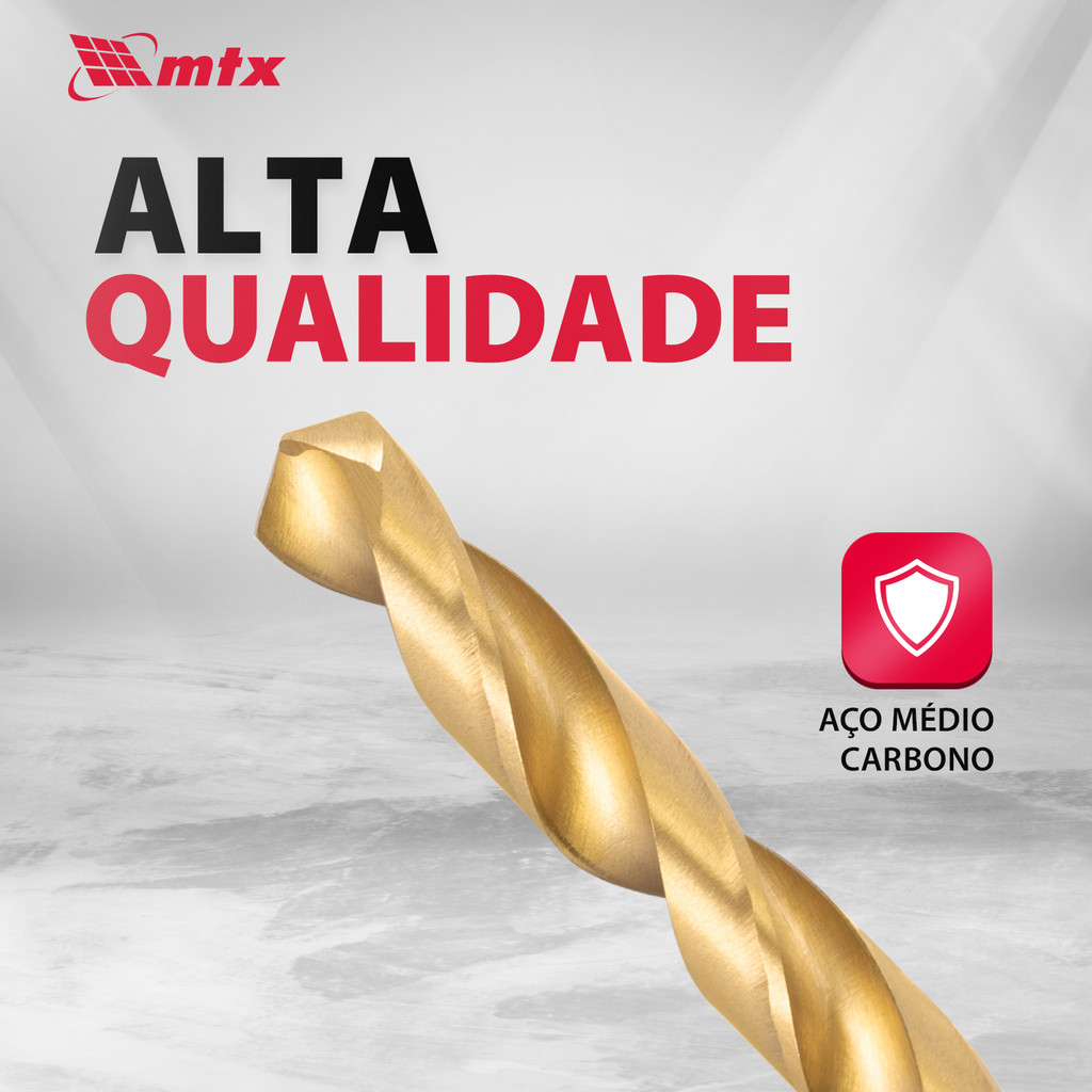 Broca MTX em Aço HSS com Revestimento de Nitreto de Titânio – Alta Precisão e Desempenho Profissional A Broca MTX com haste cilíndrica é fabricada em aço rápido HSS e possui revestimento de nitreto de titânio, oferecendo alta resistência e precisão para perfurações em metais variados. Seu ângulo de afiação de 118° foi desenvolvido para otimizar o trabalho com metais pretos, aço, ferro fundido e bronze duro, sendo ideal para profissionais que buscam resultados de alta qualidade. Principais Vantagens Confiabilidade Fabricada em aço rápido HSS universal e reforçada com revestimento de nitreto de titânio, esta broca apresenta resistência superior à corrosão e ao superaquecimento, garantindo uma ferramenta confiável capaz de suportar cargas intensas sem perder desempenho. Trabalho Eficiente A superfície polida da broca, junto ao revestimento especial, facilita a remoção eficaz de cavacos e reduz o aquecimento durante a perfuração, proporcionando um trabalho rápido, limpo e preciso que mantém a integridade do material trabalhado. Versatilidade A haste cilíndrica é compatível com a maioria dos tipos de mandris, oferecendo flexibilidade para uso em diversos equipamentos de perfuração. Essa versatilidade torna a broca indispensável em oficinas e caixas de ferramentas, adaptando-se a uma ampla gama de aplicações. Especificações Técnicas Material: Aço rápido HSS com revestimento de nitreto de titânio Ângulo de afiação: 118° Tipo de haste: Cilíndrica Indicação de uso: Metais pretos, aço, ferro fundido e bronze duro Medidas do Produto Diâmetro da broca: 10 mm