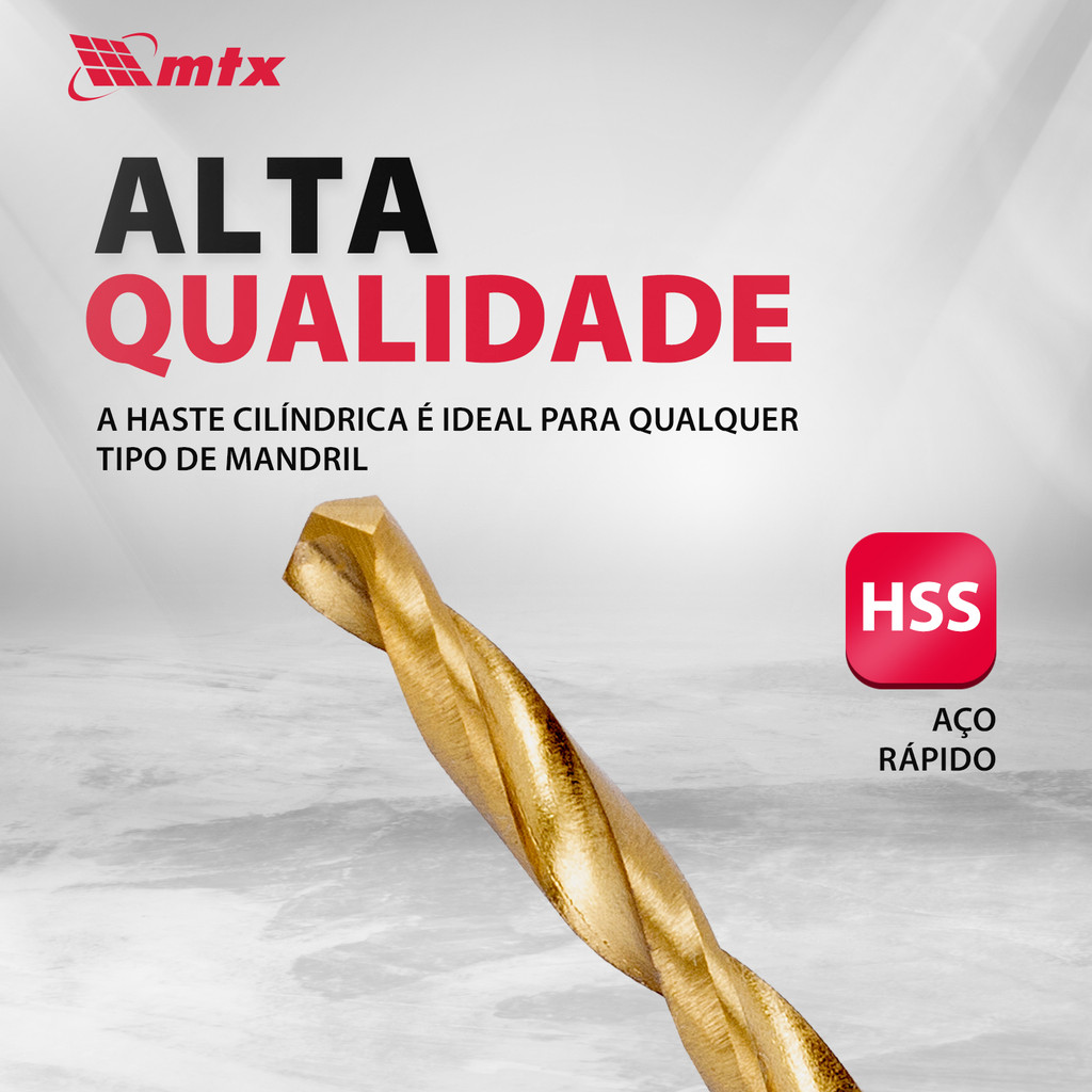 Broca MTX em Aço HSS com Revestimento de Nitreto de Titânio – Alta Performance e Precisão A Broca MTX, feita de aço rápido HSS com revestimento de nitreto de titânio e haste cilíndrica, é uma ferramenta de precisão projetada para criar furos em uma variedade de metais. Seu ângulo de afiação de 118° é meticulosamente escolhido para otimizar o trabalho com metais pretos, aço, ferro fundido e bronze duro. É a escolha ideal para profissionais que enfrentam tarefas exigentes e buscam resultados de alta qualidade. Principais Vantagens • Confiabilidade Fabricada em aço rápido HSS universal de alta resistência. Revestimento de nitreto de titânio que protege contra corrosão e superaquecimento. Suporta cargas intensas sem comprometer o desempenho da ferramenta. • Trabalho Eficiente Superfície polida que facilita a remoção de cavacos. Redução significativa do aquecimento durante a perfuração. Perfuração limpa e precisa, mantendo a integridade do material. • Versatilidade Haste cilíndrica compatível com a maioria dos mandris. Pode ser utilizada em diversos equipamentos de perfuração. Ideal para oficinas, indústrias e aplicações gerais. Especificações do Produto Material: Aço Rápido (HSS) Revestimento: Nitreto de Titânio Tipo de Haste: Cilíndrica Ângulo de Afiação: 118° Aplicação: Metais pretos, aço, ferro fundido, bronze duro Diâmetro da Broca: 3 mm Comprimento Total: 61 mm Comprimento da Parte de Corte: 33 mm Compatibilidade: Furadeiras manuais e máquinas estacionárias com mandril cilíndrico