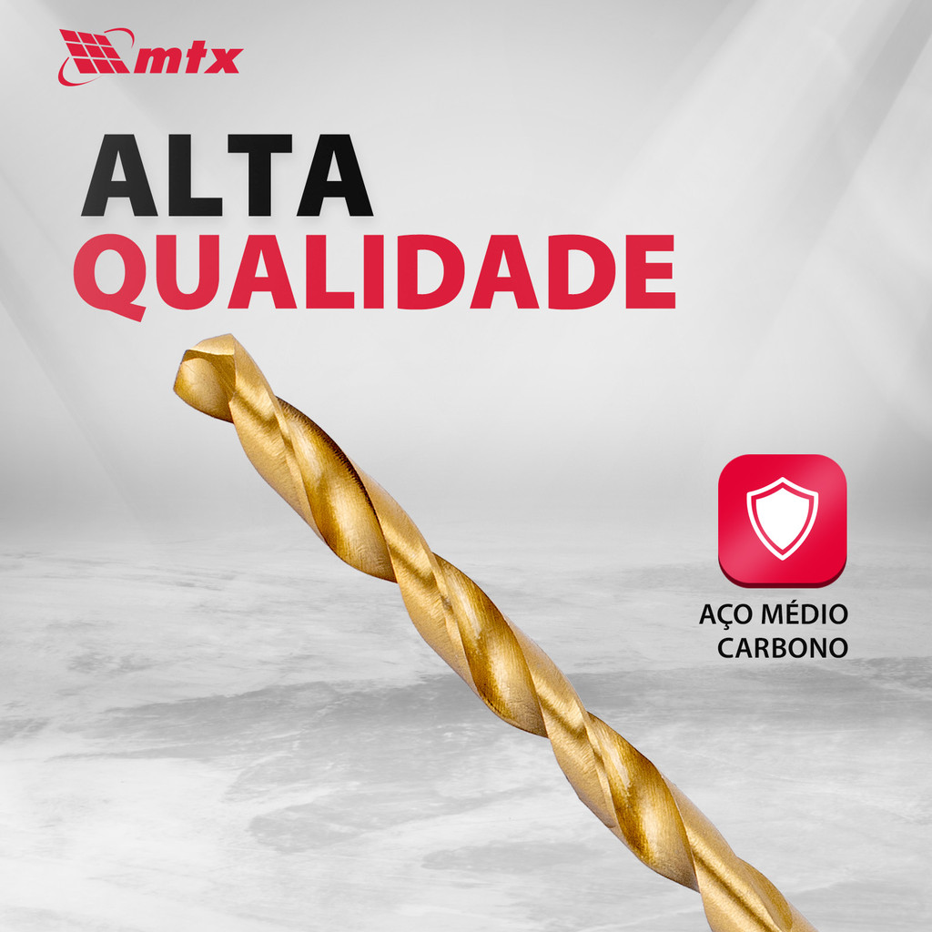 Broca MTX em Aço HSS com Revestimento de Nitreto de Titânio – Alta Performance e Precisão A Broca MTX, feita de aço rápido HSS com revestimento de nitreto de titânio e haste cilíndrica, é uma ferramenta de precisão projetada para criar furos em uma variedade de metais. Seu ângulo de afiação de 118° é meticulosamente escolhido para otimizar o trabalho com metais pretos, aço, ferro fundido e bronze duro. É a escolha ideal para profissionais que enfrentam tarefas exigentes e buscam resultados de alta qualidade. Principais Vantagens • Confiabilidade Fabricada em aço rápido HSS universal de alta resistência. Revestimento de nitreto de titânio que protege contra corrosão e superaquecimento. Suporta cargas intensas sem comprometer o desempenho da ferramenta. • Trabalho Eficiente Superfície polida que facilita a remoção de cavacos. Redução significativa do aquecimento durante a perfuração. Perfuração limpa e precisa, mantendo a integridade do material. • Versatilidade Haste cilíndrica compatível com a maioria dos mandris. Pode ser utilizada em diversos equipamentos de perfuração. Ideal para oficinas, indústrias e aplicações gerais. Especificações do Produto Material: Aço Rápido (HSS) Revestimento: Nitreto de Titânio Tipo de Haste: Cilíndrica Ângulo de Afiação: 118° Aplicação: Metais pretos, aço, ferro fundido, bronze duro Diâmetro da Broca: 6 mm Comprimento Total: 100 mm Comprimento da Parte de Corte: 58 mm Compatibilidade: Furadeiras manuais e máquinas estacionárias com mandril cilíndrico