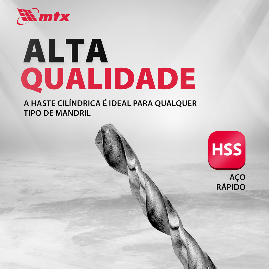 Broca Polida para Metal MTX de aço HSS com Haste Cilíndrica A Broca Polida para Metal MTX, feita em aço rápido HSS com haste cilíndrica, é uma ferramenta de alta precisão projetada para perfuração eficiente em diversos metais, incluindo metais pretos, aço, ferro fundido e bronze duro. Seu ângulo de afiação de 118° torna a broca ideal para garantir cortes precisos, durabilidade e alta performance. Vantagens Durabilidade e Alta Vida Útil: Fabricada em aço rápido HSS, suas bordas de corte são temperadas até 62-65 HRC, conferindo resistência ao desgaste e longa durabilidade, mesmo em usos intensos. Trabalho Eficiente: A superfície polida reduz o atrito nas paredes do furo, otimizando a remoção de cavacos. As ranhuras funcionam como elementos de corte adicionais, facilitando um processo de perfuração mais suave e eficaz. Design Inteligente: O diâmetro da parte de trabalho diminui em direção à haste, reduzindo o atrito e prevenindo que a broca fique presa, aumentando a segurança e eficiência da operação. Versatilidade: A haste cilíndrica é compatível com mandris universais, ampliando o uso da broca em diferentes tipos de equipamentos de perfuração. Embalagem Prática: Projetada para facilitar o armazenamento e organização, garantindo que as brocas estejam sempre disponíveis para uso rápido e eficiente. Aplicações Indicada para perfuração em metais pretos, aço, ferro fundido, bronze duro e outros materiais metálicos diversos, sendo ideal para uso profissional e hobbyistas. Especificações Técnicas Característica Detalhes Material Aço rápido HSS Dureza das bordas 62-65 HRC Ângulo de afiação 118° Tipo de haste Cilíndrica Compatibilidade Mandris universais Acabamento Superfície polida Diâmetros disponíveis 1 mm a 13 mm (varia por kit) Comprimento total De 38 mm a 100 mm (varia conforme o diâmetro)