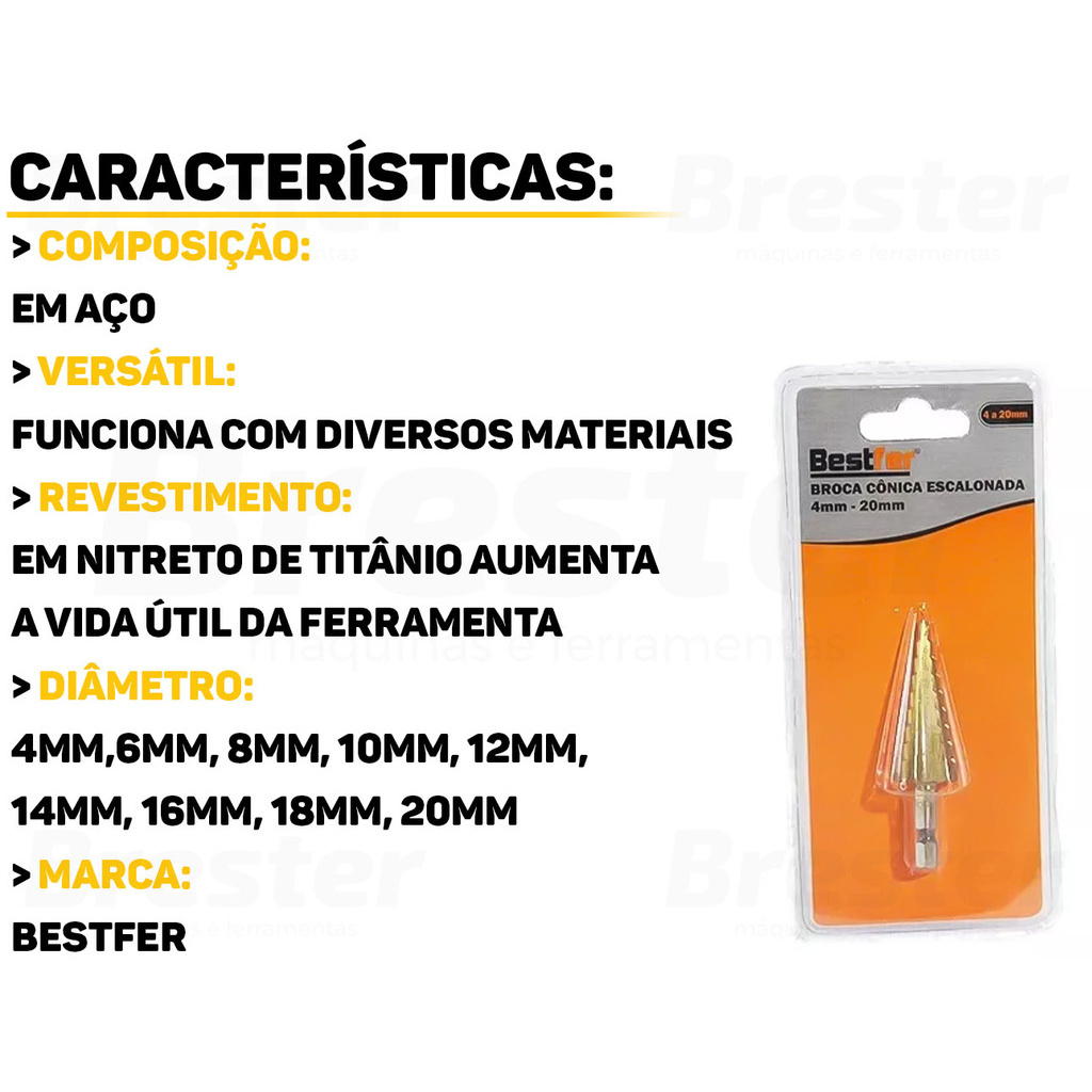 Olá, Bem vindo a Distribuidora Brester. Trabalhamos com uma grande variedade de ferramentas elétricas e manuais, descartáveis, eletroeletrônicos, artigos para casa, artigos de petshop e outros. Aqui você encontrará Produtos Originais, Nota Fiscal, Pronta Entrega e Envio Imediato! Informações do Produto: Broca Escalonada Aço Rápido 4 a 20mm Bestfer As Brocas Escalonadas da Bestfer são a melhor solução para a furação de várias medidas com a mesma broca, ampliar furos em chapas ferrosas finas e alumínios. Projetada para durar, é produzida com materiais de alta qualidade, garantindo resistência e longa vida útil. Características: > Produzida em aço rápido; > Ideal para chapas de aço com espessura máxima de até 4mm; > Estrutura de aço rápido que garante a resistência e longa vida útil. Especificações Técnicas: > Material: aço rápido; > Dimensões do Produto (C x L x A): 17 cm x 8 cm x 2,0 cm. - Marca: Bestfer - Garantia: 90 dias contra defeitos de fabricação Vantagens de comprar na Brester: - Nota fiscal para Pessoa Física e Pessoa Jurídica; - Produto novo, com garantia de fábrica; - Produto a pronta entrega; - Envio em até 24hs em dias úteis após confirmação do pagamento. Obrigado por escolher a Brester Máquinas.