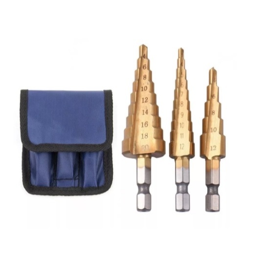 Jogo de brocas escalonadas em aço cabono contendo 03pçs 01 broca-3,4,5,6,7,8,9,10,11 e 12mm 01 broca-4,6,8,10,12,14,16,18 e 20mm 01 broca-4,6,8,10 e 12mm Acompanha estojo em lona com fechamento em velcro As brocas são em aço carbono de alta qualidades revestidas com uma camada de titâno para evitar o aquecimento, fazem furos em alumínio, bronze, plástico, nylon e madeira