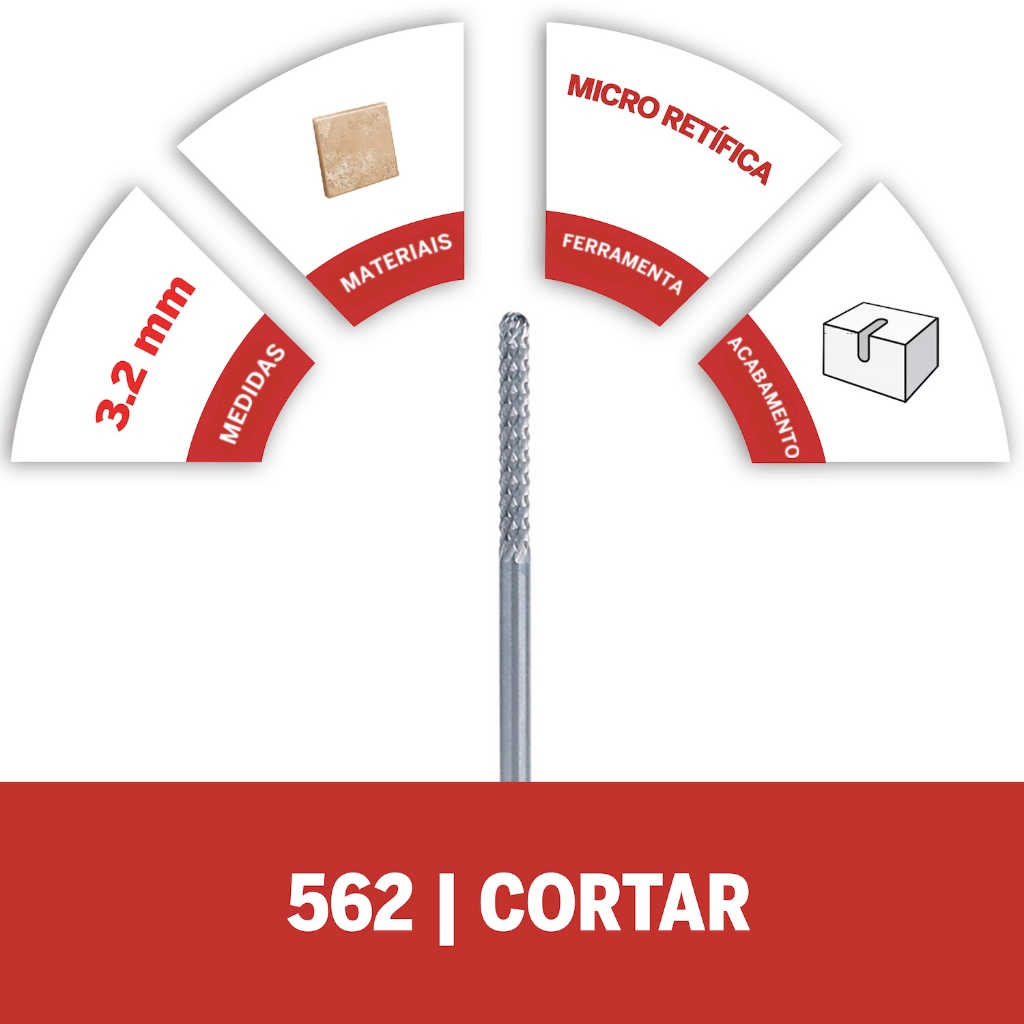 Broca De Corte 3,2mm para azulejos - Modelo 562 - Dremel VANTAGENS: - Realize cortes de forma precisa com a Broca de Corte (Modelo 562), que possui 3,2mm de diâmetro; - A Broca 562 Dremel é ideal para uso em painéis de gesso, azulejos, rejunte e uso geral; - Use velocidades mais altas para madeiras duras, velocidades mais lentas para metais e velocidades muito lentas para plásticos; - Um cortador de alta velocidade; - Ideal para o corte de drywall para caixas elétricas, saídas de ar e outras utilidades de parede; - Uso com 6 meses de garantia Dremel. ESPECIFICAÇÕES TÉCNICAS: - Marca: Dremel; - Modelo: 562 - Referência: 2615000562; - Uso: Corte; - Compatível com as micro retíficas Dremel das séries 300, 395, 3000, 400, 4000, 8220; - Diâmetro: 1/8" (3,2 mm); - Dimensões da Embalagem (C x L x A): 5,08 x 10,16 x 2,29cm; - Peso: 0,100kg. ITENS INCLUSOS: - 1 broca de corte de 3,2mm para azulejos (modelo 562).
