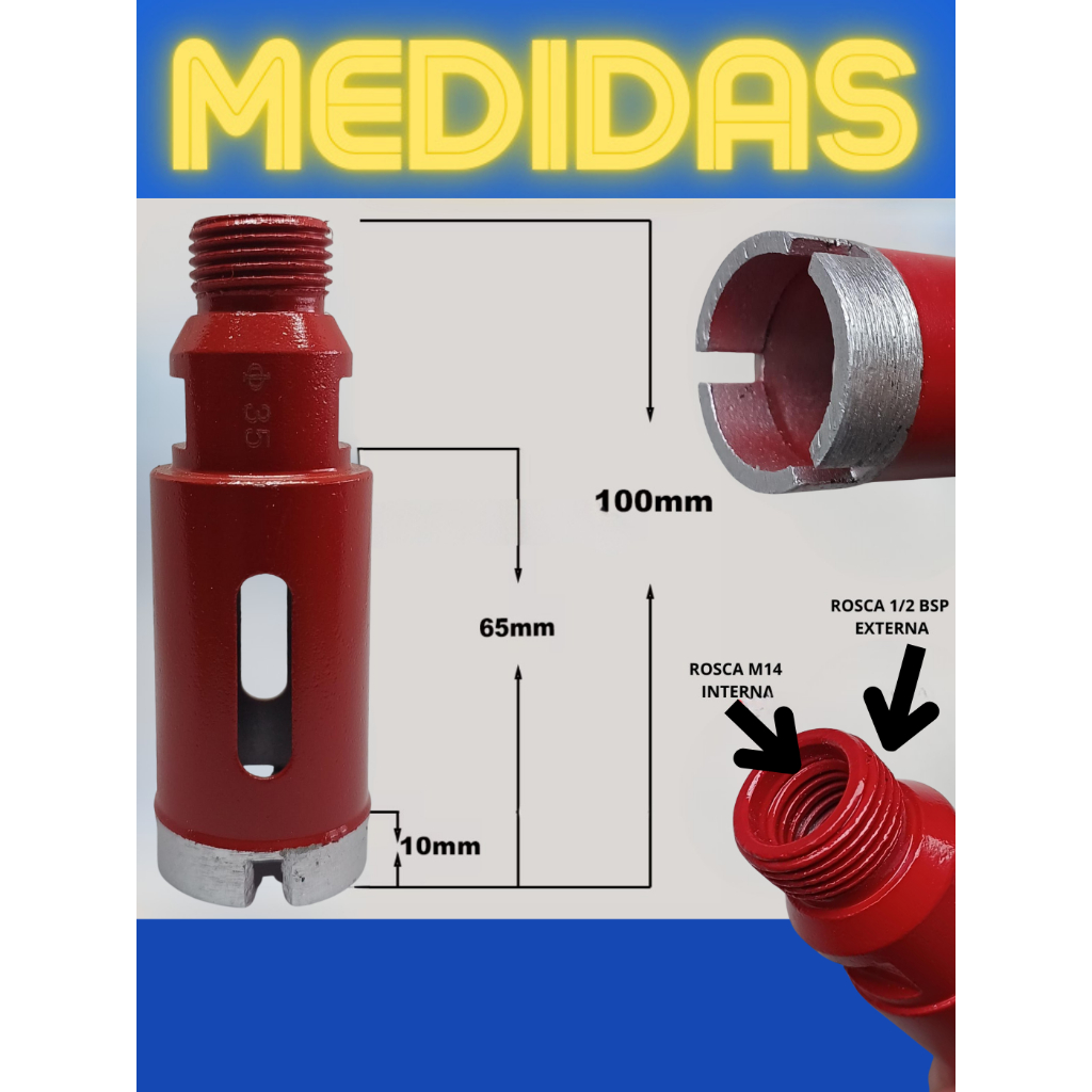 Broca Diamantada Segmentada Tipo Serra Copo – Makidú Ferramentas Escolha sua Medida: 6mm | 8mm | 10mm | 20mm | 25mm | 30mm | 32mm | 35mm | 40mm | 50mm | 60mm Alta Performance em Perfuração Profissional Broca diamantada segmentad a com corte limpo, sem rebarbas e alta resistência. Ideal para uso em marmorarias, obras e serviços de instalação de bancadas, pisos e revestimentos. Aplicações Recomendadas: Mármore Granito Porcelanato Concreto Refratários Ardósia e pedras decorativas Especificações Técnicas: Alta concentração de diamante para maior durabilidade e eficiência Velocidade operacional recomendada: 3.500 a 4.000 RPM Rosca interna M14 – compatível com lixadeiras, esmerilhadeiras e politrizes Rosca externa ½” BSP – para furadeiras de bancada Dicas de Uso: Utilize refrigeração com água durante a perfuração para prolongar a vida útil da broca e obter melhor acabamento Evite o uso a seco. Caso não seja possível utilizar água, realize a perfuração em etapas, resfriando a broca com frequência Produto indicado para uso profissional, sempre com EPIs obrigatórios Respeite as normas técnicas de segurança (NR-12) Diferenciais do Produto: Produto 100% nacional com garantia Alta durabilidade e rendimento Corte limpo e preciso, sem trincas no material Funciona em máquinas portáteis e de bancada Ideal para profissionais da construção, marmoristas e instaladores Perguntas Frequentes: O produto é novo e original? Sim, todos os nossos produtos são novos, originais e com garantia de fábrica. Tem pronta entrega? Envia no mesmo dia? Sim! Pedidos com pagamento confirmado até 12h são despachados no mesmo dia útil. Prazo máximo de envio: 24h úteis. Qual o método de envio? A logística é feita via Mercado Envios, que seleciona automaticamente a forma mais rápida (Correios ou Transportadora). Como faço o rastreamento? Basta acessar “Minhas Compras” e clicar em “Acompanhar envio”. O sistema será atualizado conforme o transporte avança. Ainda tem dúvidas? Use o campo de Perguntas e Respostas. Nossa equipe está pronta para te ajudar! Cores podem variar de acordo com o lote Produto enviado com segurança e garantia Uso exclusivo para profissionais qualificados