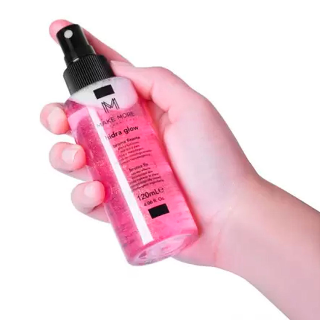 Descrição A Hidra Glow Make More foi desenvolvida exclusivamente para hidratar, revigorar, fixar e iluminar a pele. Pode ser usado pré ou pós-maquiagem. Promove um acabamento uniforme e natural da maquiagem, evitando o efeito craquelado e permitindo a fixação por mais tempo. Benefício Fixa maquiagem. Hidrata e revigora. Ilumina. Livre de Óleo. Hipoalergenica e dermatologicamente testada. Ativos: Com D-Pantenol e micro partículas de brilho. Como Usar Agite bem e com os olhos fechados, posicione o frasco a 20cm do rosto. Borrife a bruma de maneira uniforme por toda a face após a finalização da maquiagem.