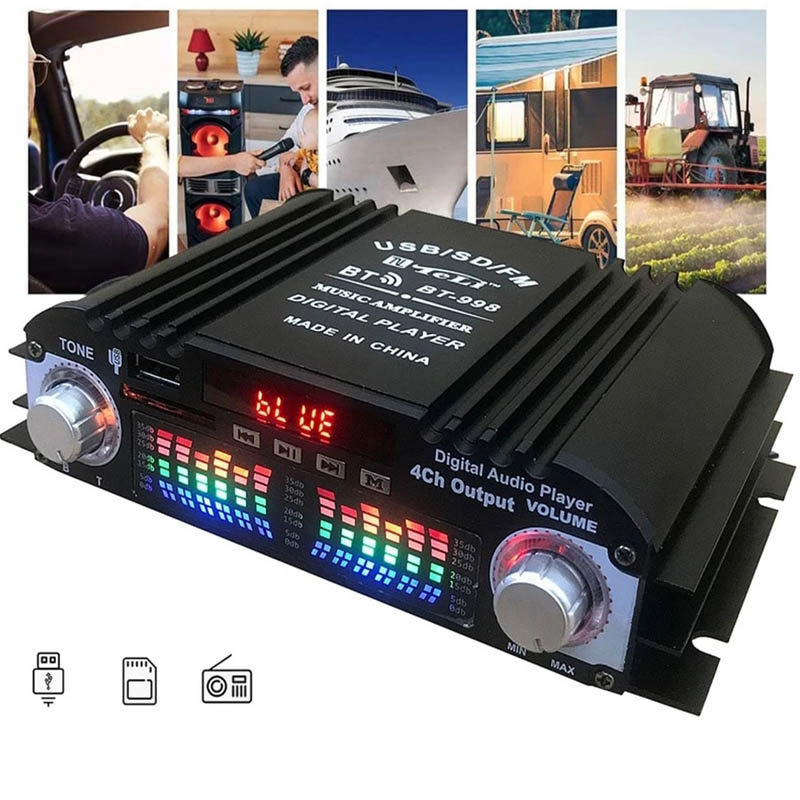 BT-998 Amplificador De Som Digital Wi-Fi , 12V , 1600W , 4 Canais , Áudio , Rádio FM , Bluetooth 5.0 , Karaokê