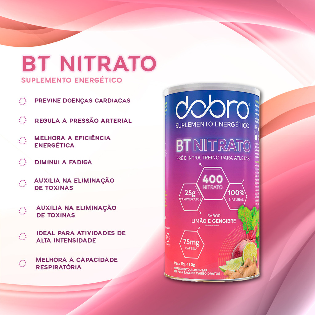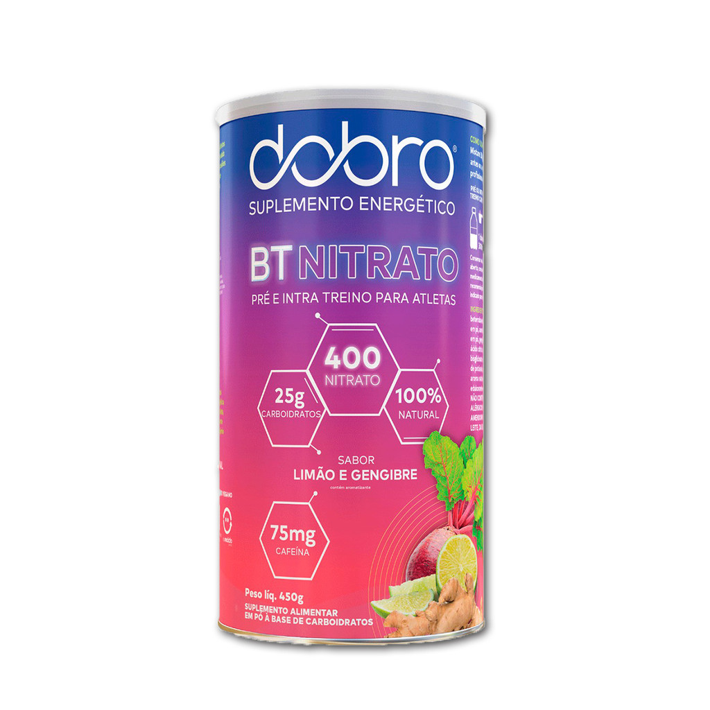 INFORMAÇÕES DE DESTAQUE - Contém 25g de carboidrato por porção; - Eletrólitos para hidratação ; - 100% natural; - 400g de nitrato; - Vegano; - Não contém glúten; - Não contém conservante; - Não contém corante; DESCRIÇÃO O BT Nitrato fornece doses eficazes e pode ser utilizado como pré-treino e intra-treino para praticantes de atividade física que buscam melhorar sua eficiência energética. O BT Nitrato aumenta o óxido nítrico e consequentemente melhora a circulação e redução de oxigênio durante o exercício. Além disso, ele também aumenta o fluxo sanguíneo, fazendo com que o músculo tenha uma maior oferta de nutrientes. Sendo assim aumentando a eficiência muscular e diminuindo a fadiga. INGREDIENTES Maltodextrina, beterraba em pó, água de coco em pó, acerola em pó, acidulante ácido cítrico, cloreto de sódio, bisciglinato de mágnesio, fosfato de potássio, bisciglinato de cálcio, aroma natural de limão, edulcorante estévia. Não contém glúten. SUGESTÃO DE USO Misture 30g (1 dosador) em 300ml de água. Consumir 1h-2h antes (em caso de pré-treino) ou a cada 45min (em caso de intra-treino), conforme sua necessidade. Consulte um nutricionista ou profissional da saúde para verificar a dosagem adequada.