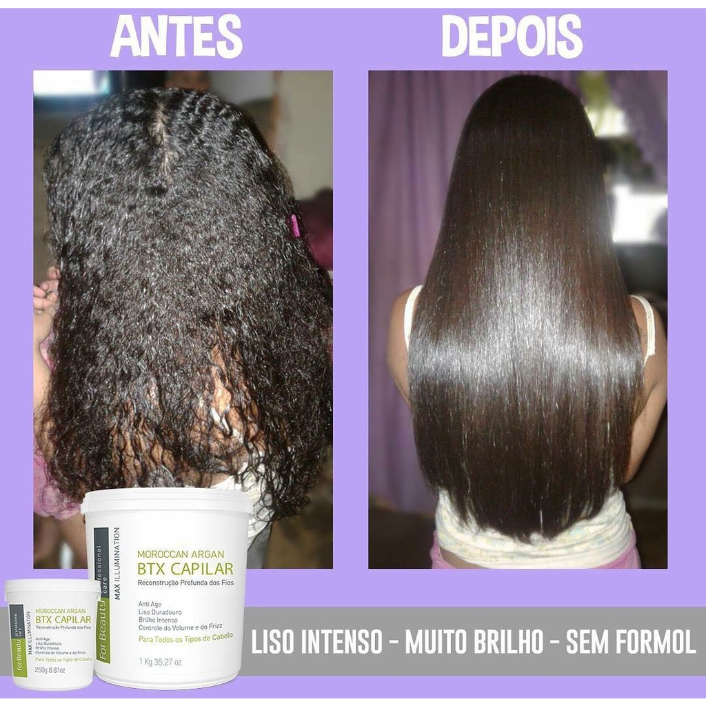 Descrição O Max Illumination é um revolucionário tratamento para cabelos com frizz, volumosos e secos com resultado inigualável. Com tecnologia de última geração, a linha MAX ILLUMINATION é especialmente indicado para nutrição, reparação, e proteção dos seus cabelos. Compatível com todos os processos químicos. Não altera a cor dos cabelos Reparação absoluta Brilho intenso Passo a passo de como usar 1 - Lave os cabelos com um Shampoo Pré Tratamento. Seque 80% dos fios com secador; Separe o cabelo em 6 partes; 2 - Com auxílio de pente e pincel, inicie o processo de aplicação do btx Argan For Beauty, em uma das mechas da parte posterior. Repita este procedimento em todas as mechas; 3 - Deixe o produto em pausa sobre os fios de acordo com a estrutura do cabelo (30 min para cabelos levemente ondulados – até 1h para cabelos mais resistentes); 4 - Após o tempo de pausa recomendado, enxágue bem os fios, para retirar todo o produto. Com uma toalha retire o excesso de água, seque com auxílio do secador e escove. Separe novamente o cabelo em quadrantes; 5 - Com prancha em temperatura máxima, trabalhe cada mecha fina cerca de 10x, para a perfeita finalização do tratamento. Atenção: Para cabelos loiros ou vermelhos, além de tirar o produto com água, use um Shampoo Hidratante com pH 3,5-4,5, para que não haja alteração de cor; Conteúdo da compra: 01 Botox Capilar Argan For Beauty 1Kg Resultado: - Brilho Extremo ; - Hidratação Máxima; - Nutrição; - Maciez; - Sedosidade; - Realinhamento Capilar e Redução de Frizz 100% ; - Reconstrução Instantânea; - Força e Nutrição combatendo a quebra dos fios; - Repositor de Massa Capilar perdida pelas agressões químicas; - Cauteriza a parte interna da fibra; - Proteção contra as altas temperaturas; - Condicionamento e desembaraço; - Brilho Intenso; - Crescimento Saudável;