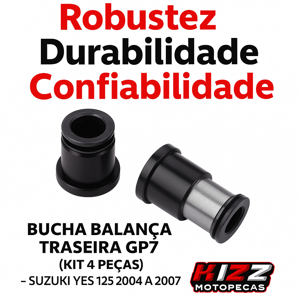O Kit de Buchas da Balança Traseira GP7 é a solução ideal para manter sua moto estável, segura e confortável. Produzidas em material de alta resistência, as buchas asseguram o encaixe perfeito da balança traseira, eliminando folgas, reduzindo ruídos e preservando a vida útil da suspensão. Composto por 4 peças, este kit foi projetado especialmente para a Suzuki Yes 125 de 2004 a 2007, oferecendo praticidade na substituição e garantindo o desempenho original da motocicleta. Benefícios Reduz folgas e ruídos no sistema traseiro Mais estabilidade e dirigibilidade segura Aumenta a durabilidade da balança e da suspensão Kit completo com 4 peças para substituição prática Qualidade confiável GP7 Compatibilidade Compatível com os seguintes modelos Suzuki: Yes 125 (2004 a 2007) (Recomendamos confirmar a compatibilidade no manual da moto ou com seu mecânico antes da instalação.) Informações Importantes para o Cliente Produto novo e de alta resistência, com encaixe preciso para a Suzuki Yes 125. Instalação prática, sem adaptações. A Kizz Moto Peças garante envio rápido, seguro e bem embalado, além de suporte especializado para ajudar você em todas as etapas da compra. Motivos para Comprar na Kizz Moto Peças Loja especializada em motopeças, referência em confiança e qualidade Trabalhamos apenas com marcas de renome como GP7, Texx e Darom Envio ágil para todo o Brasil Atendimento humanizado e suporte técnico dedicado Excelente custo-benefício com qualidade comprovada Garanta agora o Kit de Buchas da Balança Traseira GP7 para Suzuki Yes 125 (2004 a 2007) e mantenha sua moto sempre segura, estável e pronta para rodar. Imagens Meramente Ilustrativas