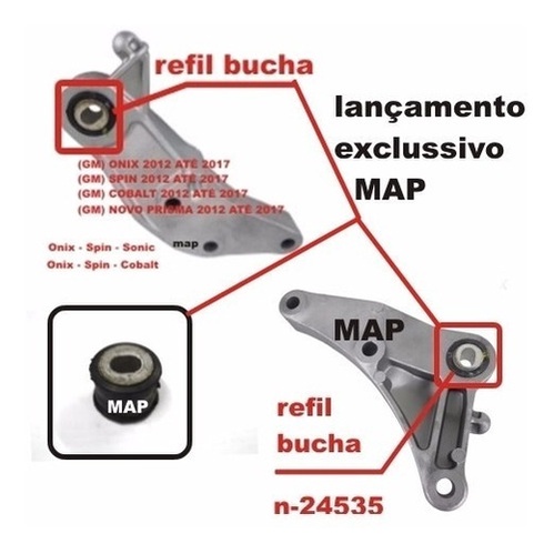 1 - Bucha do suporte Coxim do Motor/Câmbio Restritor de Torque ***Número da peça: 96852643BUCHA REFIL*** ***SERVE NOS MODELOS COM CÂMBIO AUTOMÁTICO E MANUAL.*** PRODUTO NOVO, DA MAP APLICAÇÃO: ONIX/COBA/SPIN/PRISMA/SONIC/CORS - CHEVROLET - ONIX - 2012 EM DIANTE - CHEVROLET - COBALT - 2012 EM DIANTE - CHEVROLET - PRISMA - 2012 EM DIANTE - CHEVROLET - SPIN - 2012 EM DIANTE - CHEVROLET - SONIC - 2012 EM DIANTE *INFORMAÇÕES IMPORTANTES* 1 - NOSSOS PRODUTOS NÃO SÃO RECOMENDADOS PARA ADAPTAÇÕES, MAS SIM PARA REPOSIÇÃO. 2 - ANALISE COM CAUTELA A APLICAÇÃO DA PEÇA E, SE NECESSÁRIO, VERIFIQUE COM SEU MECÂNICO DE CONFIANÇA UTILIZANDO AS FOTOS DO ANÚNCIO PARA TER CERTEZA DE QUE ESTA É A PEÇA QUE VOCÊ REALMENTE PRECISA. 3 - SE ASSEGURE DE ESTAR EFETUANDO A COMPRA CORRETA PARA EVITAR EVENTUAIS PROBLEMAS E GASTOS. 4 - PRODUTOS QUE NECESSITAM INSTALAÇÃO A MESMA DEVE SER FEITA POR UM PROFISSIONAL CAPACITADO. 5 - NÃO NOS RESPONSABILIZAMOS POR USO INDEVIDO OU INSTALAÇÃO INCORRETA. 6 - NÃO ACEITAMOS DEVOLUÇÃO DO PRODUTO SEM A EMBALAGEM ORIGINAL. 7 - TODOS PRODUTOS SÃO NOVOS COM 3 MESES DE GARANTIA E NOTA FISCAL. 8 - A POSTAGEM É FEITA NO MESMO DIA PARA PEDIDOS FEITO ATÉ AS 13H. 9 - TIRE TODAS AS DUVIDAS ANTES DE CLICAR EM COMPRAR. • AGRADECEMOS A SUA PREFERÊNCIA! N-24535