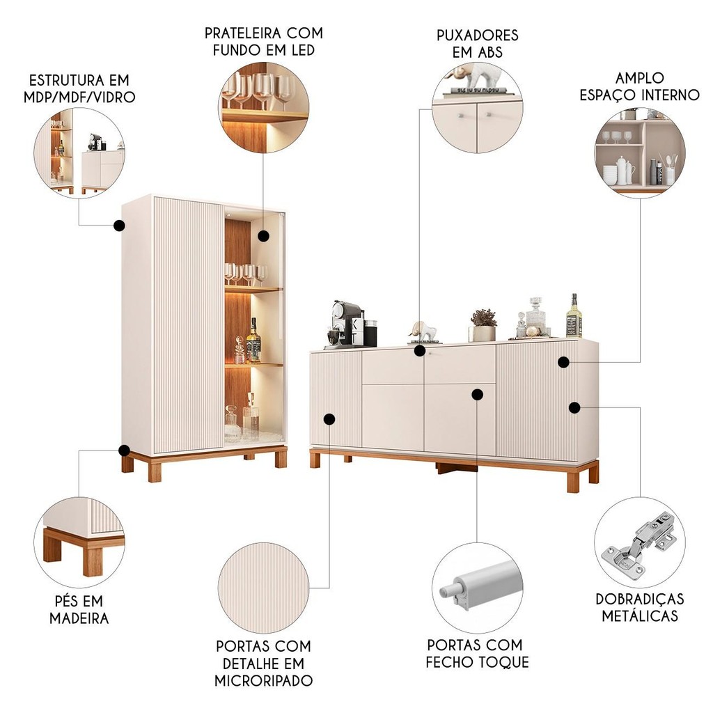 Buffet Aparador e Cristaleira com LED Lucca Off White/Freijó C01 - Mpozenato O Buffet e Cristaleira Lucca, são duas peças essenciais para quem busca sofisticação, design moderno e funcionalidade. Esse conjunto une elegância e praticidade, criando um ambiente repleto de estilo e personalidade. O Balcão Buffet composto por quatro portas convencionais, sendo duas laterais com textura microripada e fecho toque, e portas centrais com puxador ponto em ABS, seu tampo amplo é perfeito para organizar bebidas, cafeteiras ou objetos decorativos, agregando funcionalidade e charme ao ambiente. A Cristaleira Porta De Vidro com LED de complementa com seu design contemporâneo e detalhes sofisticados. Composta por duas portas, uma de vidro com puxador ponto em ABS e outra microripada, traz um visual clean e moderno. Seus pés em cavalete proporcionam amplitude, enquanto a iluminação interna em LED nas prateleiras destaca a beleza de objetos como taças, cristais ou outras peças de decoração. A escolha ideal para quem deseja transformar sua Sala De Jantar ou Sala De Estar em um ambiente elegante, prático e repleto de estilo. Design Moderno, funcionalidade e qualidade se encontram nesse conjunto que traz versatilidade e beleza para o seu espaço. ESPECIFICAÇÕES Dimensão dos Produtos (L x A x P) Buffet: 179 cm x 77 cmx 37,9 cm. Cristaleira: 90 cm x 153 cm x 38 cm. Peso: 86,6 Kg. Características do Produto Material da Estrutura: MDP/MDF/Vidro. Espessura das Chapas: 15mm/25mm. Peso Suportado Distribuído: 55 kg distribuidos. Acabamento: Pintura UV. Escala de Brilho: Brilhante/Fosco. Possui Prateleiras: Sim. Quantidade de Prateleiras: 5 Prateleiras. Material da Prateleiras: MDP. Possui Portas: Sim. Quantidade de Portas: 6 Portas. Material da Porta: MDP/Vidro. Tipo de Dobradiças: Metálicas. Tipo de Porta: Convencional. Possui Gavetas: Não. Possui Puxador: Sim. Material do Puxador: ABS. Possui Nicho: Não. Possui LED: Sim. Possui Pés: Sim. Material dos Pés: Madeira. Diferenciais: - Design moderno. - Porta em MDP, com fecho toque. - Portas com detalhe microripado. - Prateleiras amplas. - Prateleiras com fundo em LED. - Pés em madeira Sistema de Montagem: Cavilhas/Parafusos/Girofix. Manual de Montagem: Sim. Complexidade da Montagem: Média. Volumes: 3 Volumes. Conteúdo da Embalagem: 1 Cristaleira. Garantia do Fabricante: 90 dias contra defeito de fabricação. Montagem: Recomendamos que seja feita por um profissional. Recomendação de Limpeza: Utilize pano levemente úmido. Observações importantes: - Produto para uso residencial em ambiente interno, não devendo ficar exposto diretamente ao sol, calor e umidades excessivas. - Pode haver alguma diferença de tonalidade entre a imagem e o produto real, por conta do tratamento de imagens e a calibração de cores do seu monitor. - As imagens são meramente ilustrativas, não acompanham objetos de decoração e eletrônicos. - Ao receber a mercadoria, o cliente deve verificar as condições da embalagem, caso haja algum problema não assine o comprovante de recebimento. - Montagem, desmontagem e outras instalações serão de responsabilidade do cliente. Não nos responsabilizamos, no ato da entrega, por subir escadas/elevadores ou pelo transporte por guincho em apartamentos. Eventuais despesas são de responsabilidade do comprador. - Confira as dimensões do produto e certifique-se de que passará normalmente por supostos elevadores, portas, escadas e/ou corredores de sua residência.