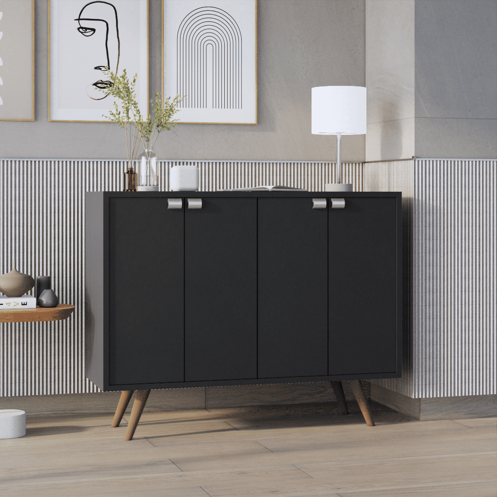 Loja Oficial - Envio Imediato para todo o Brasil Este buffet aparador de 3 ou 4 portas com pés retrô combina sofisticação e praticidade para transformar o ambiente de sua sala de jantar, hall ou qualquer outro cômodo de sua casa. Seu design no estilo retrô, com pés palito, traz um toque de charme e modernidade, perfeito para quem busca um móvel funcional e cheio de personalidade. Características Buffet 4 Portas -Comprimento: 109 cm -Altura: 88 cm -Profundidade: 33 cm -Prateleiras: 4 -Portas: 4 -Material: MDP 12mm Características Buffet 3 Portas -Comprimento: 90 cm -Altura: 77cm -Profundidade: 33 cm -Prateleiras: 3 -Portas: 3 -Material: MDP 12mm