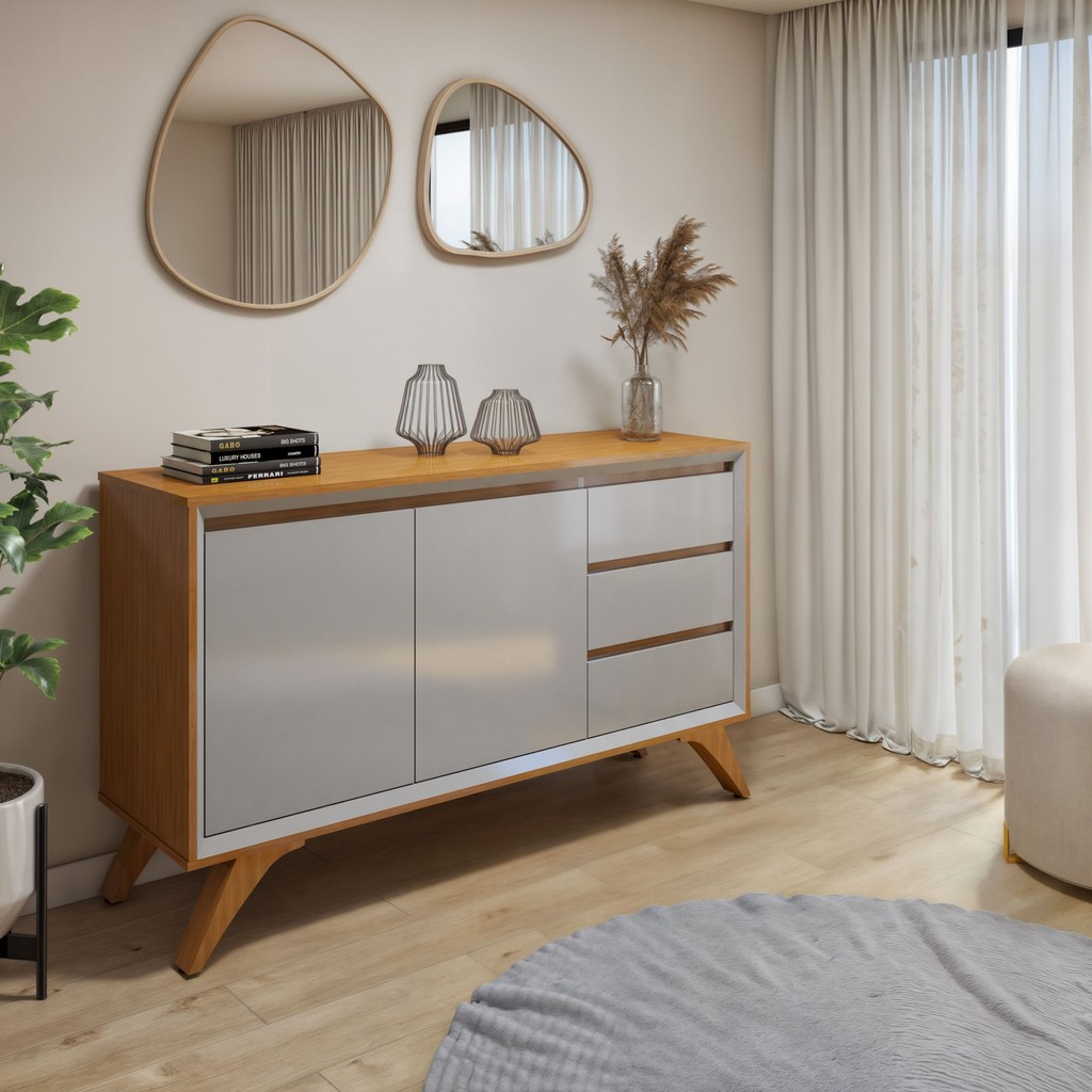 Buffet para Sala de Jantar Laqueado 100% MDF 2 Portas Pés Madeira Maciça Málaga Off White/Naturalle