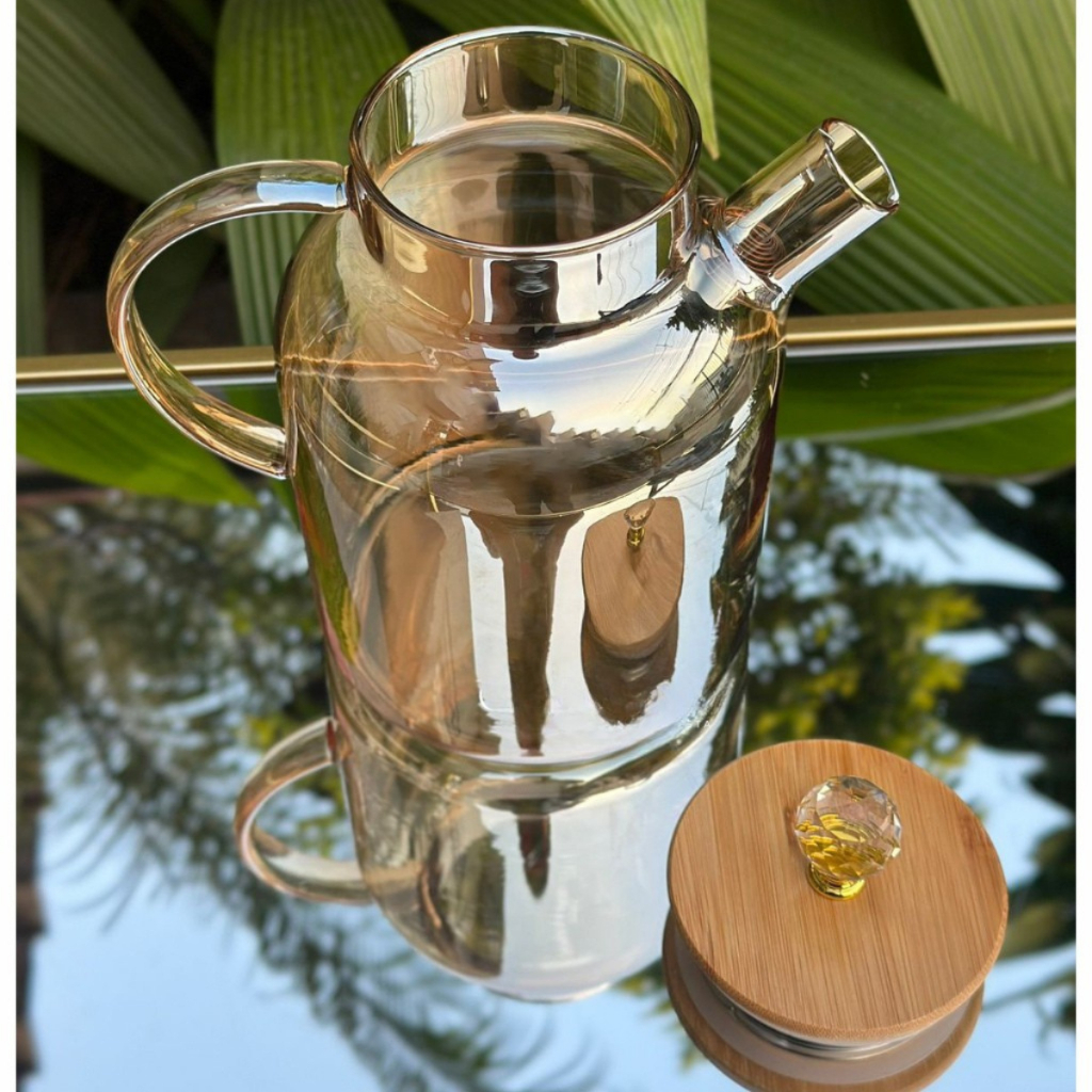 Bule Chaleira de Vidro Âmbar que vai ao fogo Borossilicato com Infusor cozinha Tampa Bambu 1,8Litros