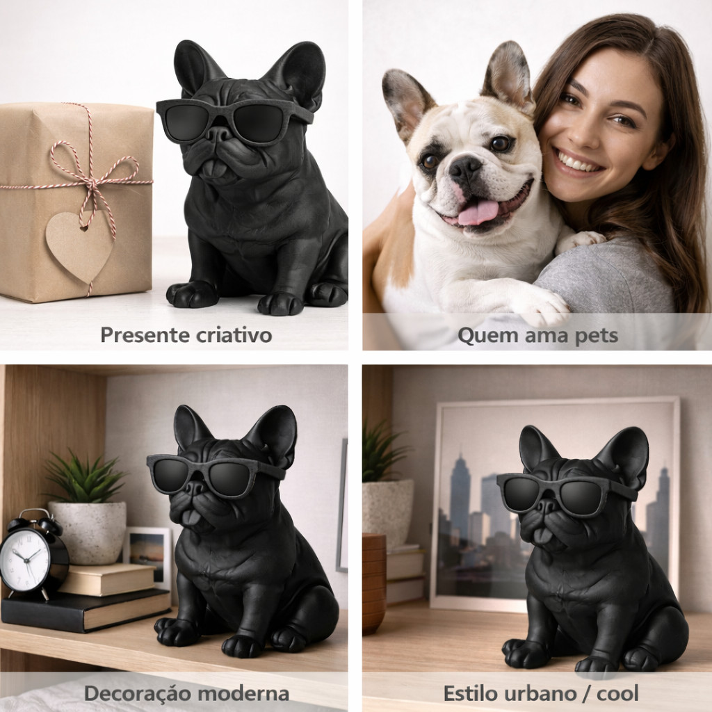 Bulldog Decorativo com Óculos Preto 14cm | Estátua Moderna | Decoração para Sala e Escritório