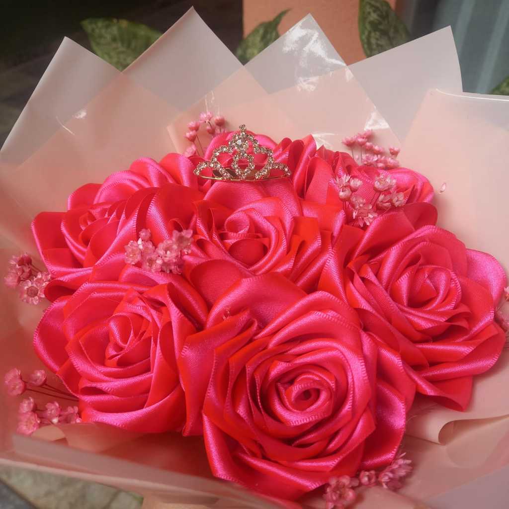 Buquê 7 Rosas com Mini Coroa | Buquê de Flores de Cetim com Mini Coroa | ESCOLHA A COR | LEIA A DESCRIÇÃO