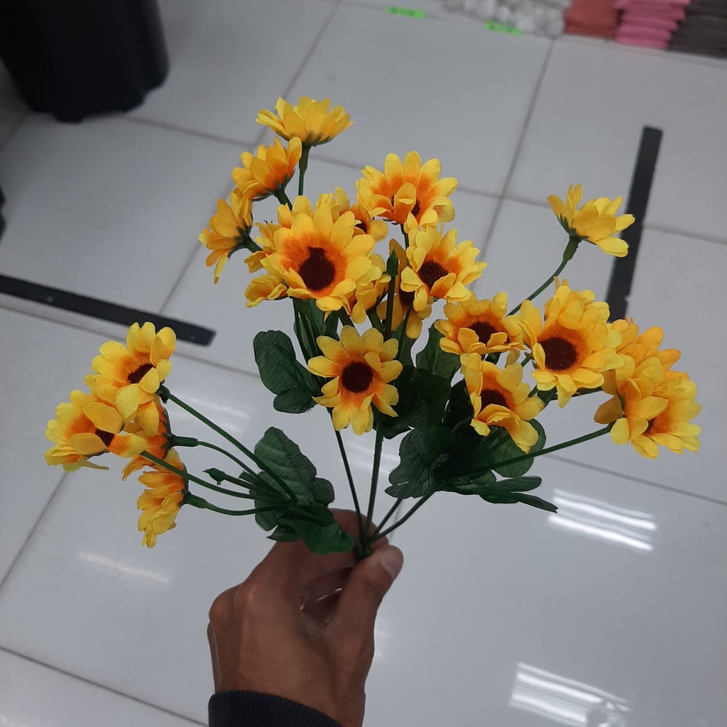 Arranjo com 24 flores de Girassol produto de ótima qualidade artificial perfeito para montar arranjos, decoração, cestas e muito mais pedidos ate as 13 horas são enviados no mesmo dia. Dimensões aproximada do produto: Altura:30 cm Diâmetro de cada flor 4cm composição: Seda, arame e plástico aguardamos sua compra.