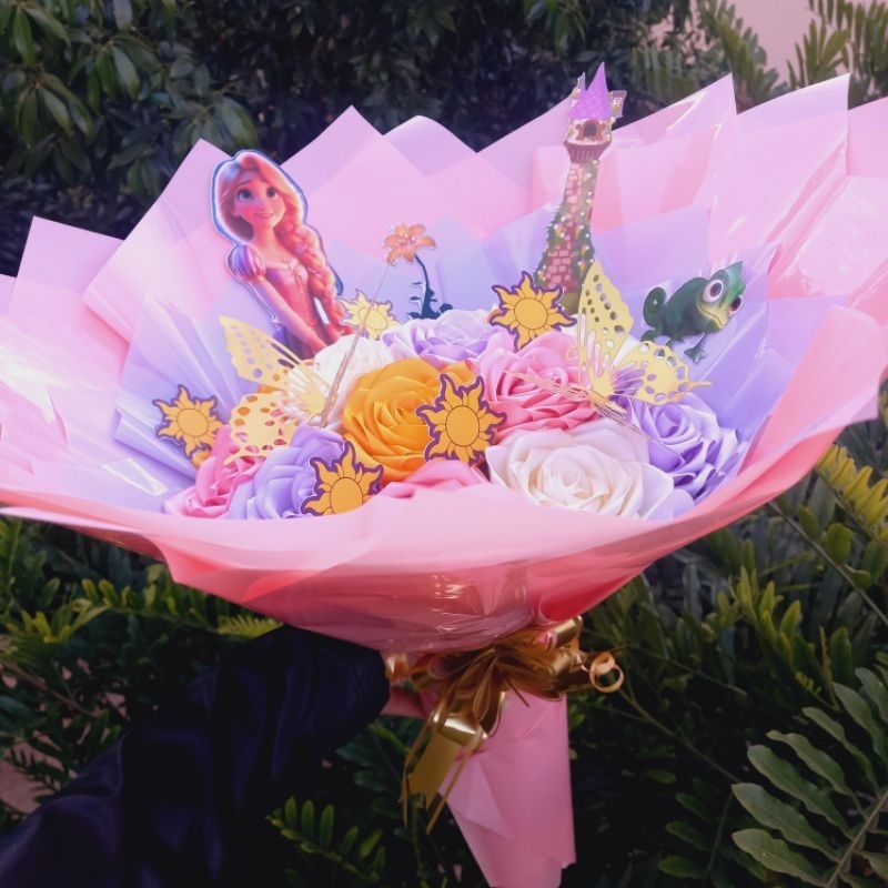 Buquê Rapunzel de cetim | Buquê Enrolados - ESCOLHA A PERSONAGEM