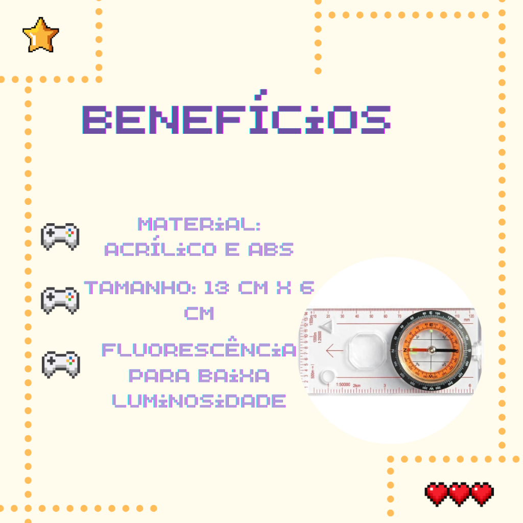 A bússola de alta precisão com régua multifuncional é o acessório ideal para quem busca praticidade e confiança em atividades ao ar livre. Compacta, resistente e fácil de transportar, ela conta com lente de aumento, marcações de escala e indicador de pontos cardeais, garantindo orientação segura em trilhas, camping, pesca, caça e muito mais. Produzida em material durável, é perfeita para aventureiros que valorizam qualidade e funcionalidade em um único item. O QUE VOCÊ IRÁ RECEBER? 01 Bússola de alta precisão com régua multifuncional 01 Cordão para transporte seguro BENEFÍCIOS ALTA PRECISÃO PARA ORIENTAÇÃO SEGURA MULTIFUNCIONALIDADE EM UM ÚNICO PRODUTO MATERIAL RESISTENTE E DURÁVEL FÁCIL TRANSPORTE COM CORDÃO INCLUSO IDEAL PARA DIVERSAS ATIVIDADES AO AR LIVRE CARACTERÍSTICAS Disco graduado de 360º para navegação precisa Régua com marcações de escala e lupa integrada Material em acrílico e plástico ABS Tamanho compacto e leve para facilitar o uso PERGUNTAS FREQUENTES Tem o produto à pronta entrega? Sim, todos os produtos estão disponíveis para envio imediato. Em quanto tempo será enviado? Após a confirmação do pagamento, o envio é realizado em até 24 horas úteis. O produto possui garantia? Sim, oferecemos garantia contra defeitos de fabricação. E se eu não ficar satisfeito com a compra? Você pode solicitar a devolução em até 30 dias após o recebimento, de forma simples e prática. palavras-chave: bussola, lente de aumento, régua 10cm, camping, acampamento, trilha, pesca, profissional, acessório, portátil, bolso