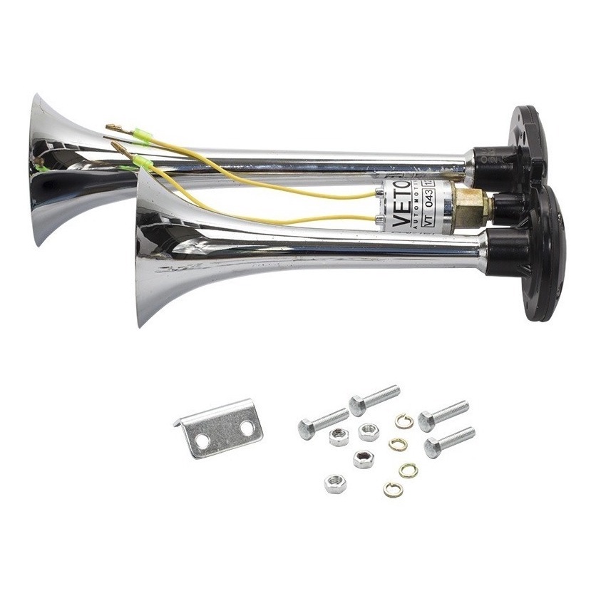 Descrição Par de Buzinas Automotivas Eletropneumáticas com Cornetas Cromadas.Eleve a potência e o impacto da buzina do seu caminhão com esse par de buzinas cromadas. Ela possui duas cornetas fabricadas em metal resistente e acabamento em cromo espelhado, ideal para uso externo.Cor Disponível:• Cromado Especificação Técnica:• Compatibilidade Universal• Tensão de Operação:24V• Intensidade: 105 - 118 dB;• Não Acompanha Botão• Fabricado em Plástico Resistente• Com Cromo de Alta Qualidade• Fácil Instalação• Comprimento das Cornetas: 29cm e 23,7cm• Dimensões da válvula solenóide (DxL): 3,5x6cmATENÇÃO: ESTA BUZINA UTILIZA O SISTEMA DE AR DO VEÍCULO PARA FUNCIONARConteúdo da Embalagem:• 2 Cornetas• Kit de Fixação