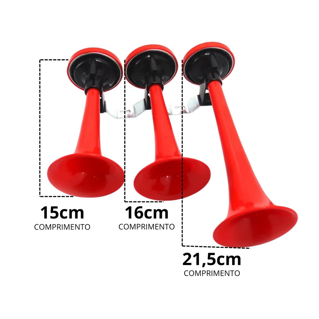 BUZINA A AR 3 CORNETAS VERMELHA CAMINHÃO TRUCK VERDUREIRO • ACOMPANHA NA CAIXA: - 3 CORNETAS - 104101-102 - 1 SUPORTE DE FIXAÇÃO DAS CORNETAS - 1 CONEXÃO Y - TUBO TRANSPARENTE • MEDIDAS DAS CORNETAS: - CORNETA A: 15 Cm - CORNETA B: 16 Cm - CORNETA C: 21,5 Cm • APLICAÇÃO: - CAMINHÃO - CARRO - MOTO - VAN - KOMBI EM CASOS DO COMPRADOR SER PESSOA JURÍDICA (CNPJ), PODERÁ OCORRER COBRANÇA DE IMPOSTO APÓS A COMPRA, DO QUAL SERÁ REPASSADO PARA O COMPRADOR.