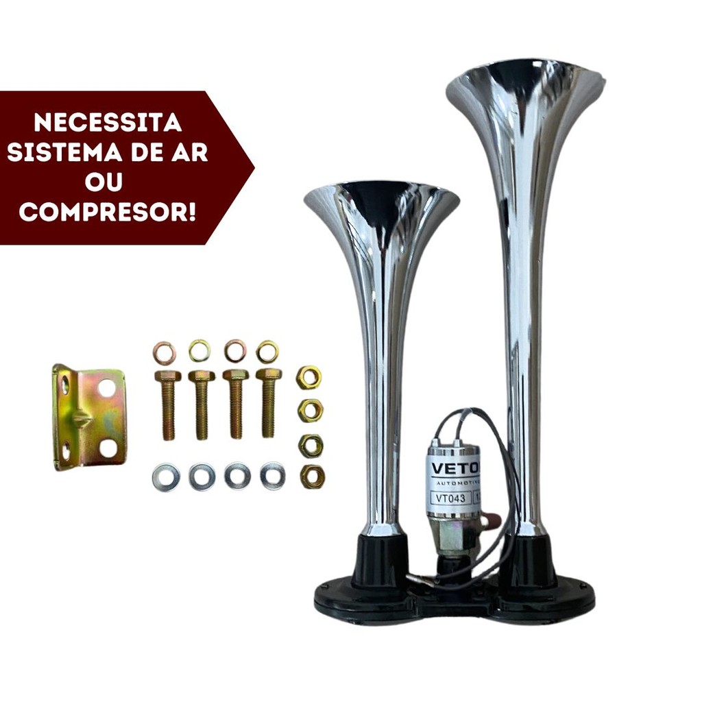 Buzina Dupla 2 Cornetas Cromada a Ar Com Valvula Eletrica 12v Vetor VT043