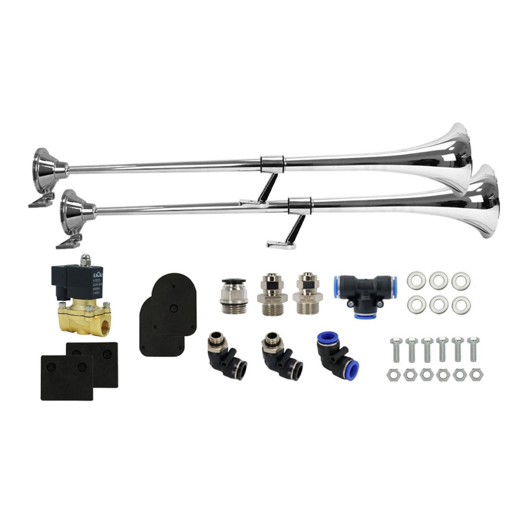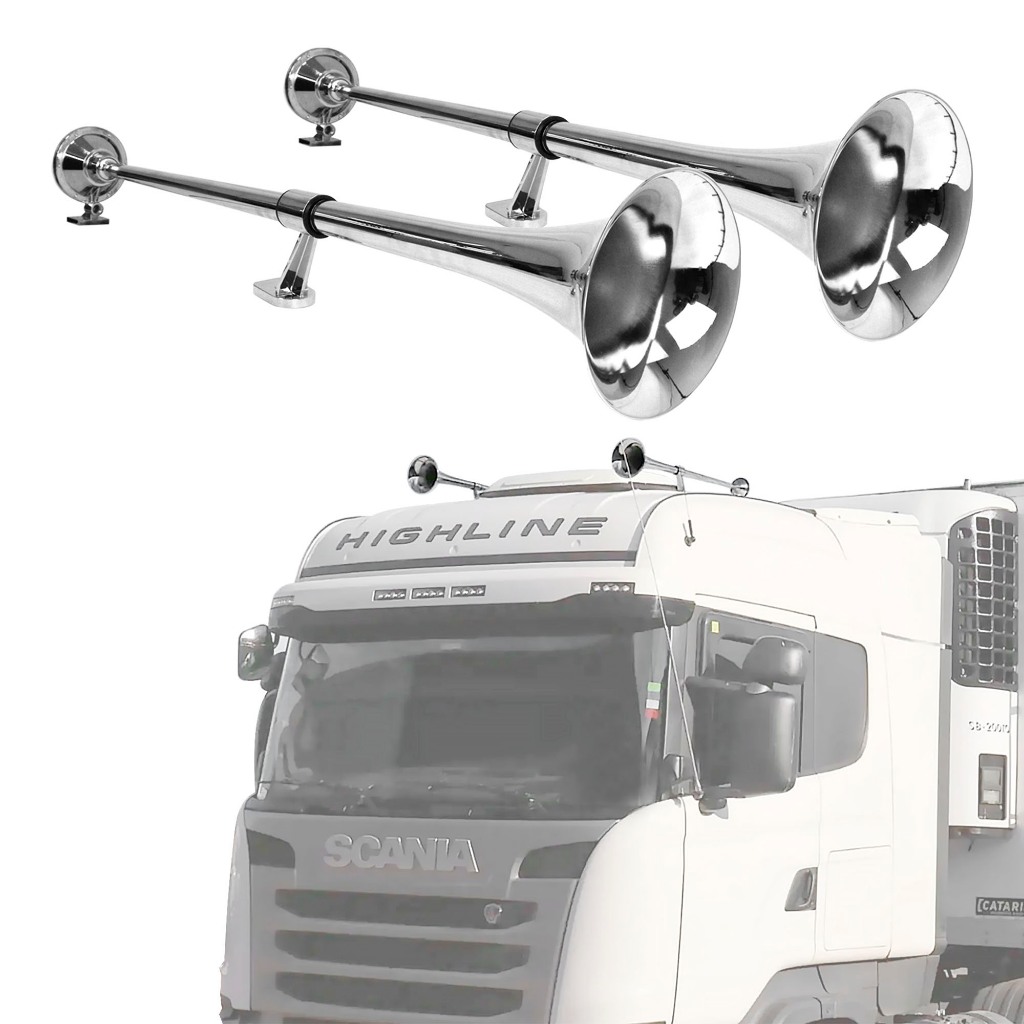 Buzina Maritima Caminhão 1 Metro Par Kit 24V Completo Com Válvula 1/2 Conexões Cromada Caminhão