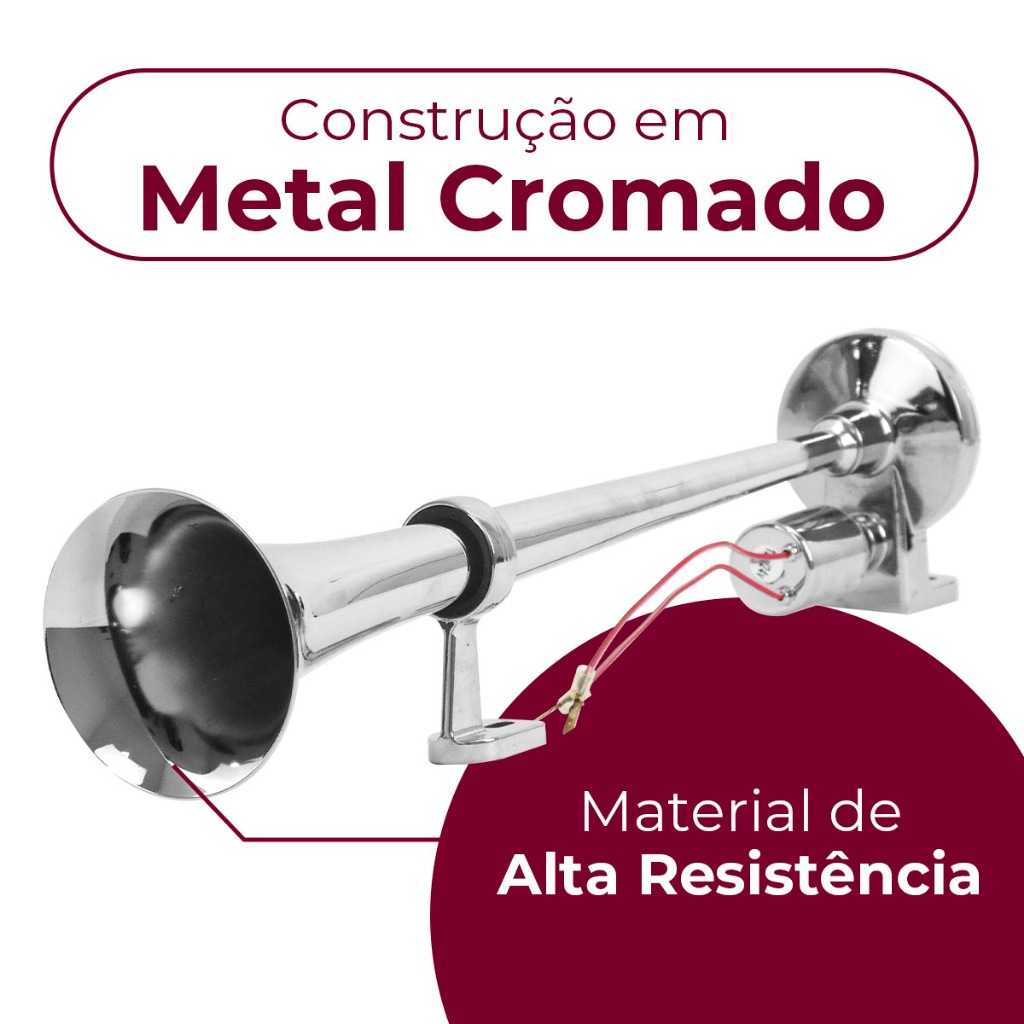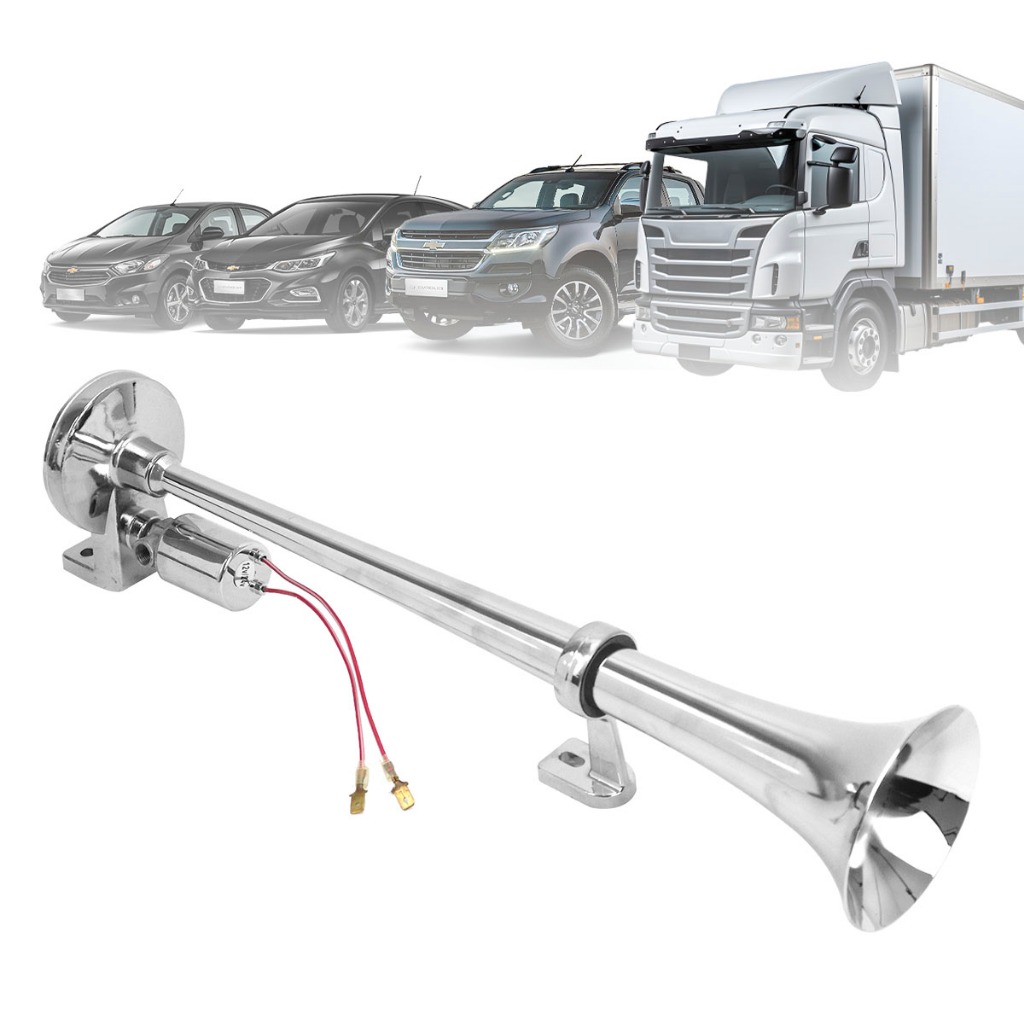 Buzina Maritima Caminhão Bivolt 45cm 1 Corneta Cromada Com Válvulas Suporte Eletropneumática Kauai