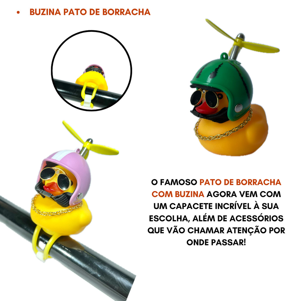 BUZINA PATO DE BORRACHA COM ACESSÓRIOS – ESCOLHA SEU MODELO DE CAPACETE! Chegou o acessório mais divertido, estiloso e funcional para sua bike, moto, patinete ou até mesmo para decorar seu espaço! O famoso Pato de Borracha com Buzina agora vem com um capacete incrível à sua escolha, além de acessórios que vão chamar atenção por onde passar! VOCÊ RECEBE: - 1 Pato de borracha com buzina embutida - 1 Capacete (escolha seu modelo favorito!) - 1 Óculos escuro tipo aviador - 1 Corrente dourada decorativa - 1 Luz LED interna que pisca - Elástico para prender facilmente onde quiser CARACTERÍSTICAS: - Buzina divertida e com som agudo - Borracha macia de alta qualidade - Luz LED que pisca (ideal para alertar ou decorar) - Design estiloso com capacete + óculos + colar - Fácil de instalar e remover ONDE USAR: - Bicicletas - Patinetes - Motos - Capacetes - Mesas, estantes ou onde sua criatividade mandar! IMPORTANTE: - Venda unitária – 1 unidade por compra - Escolha o modelo de capacete no momento da compra - Todos os modelos acompanham os mesmos acessórios Conteúdo da embalagem 1X BUZINA PATO DE BORRACHA COM CAPACETE - UN ATENÇÃO, CLIENTE!! Antes de finalizar sua compra, verifique as medidas e a compatibilidade do produto com sua bicicleta. Se tiver dúvidas, estamos à disposição para te ajudar! FOTOS E VÍDEOS PRODUZIDOS DIRETAMENTE POR NÓS,COM PRODUTOS REAIS!!!